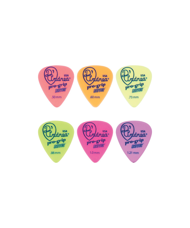 Pro plettri-Grip Brites Di D'Andrea USA are printed in Delrin with an alternative material suitable for a better sliding of the pickup on the strings. Each plectrum is made with the increasingly widespread delin / acetal and is designed and carefully designed for maximum memory and minimum wear that made these accessories famous. These pledtri start from the traditional 351, but slightly customized shape with a sharper point. The surface that affects the rope offers guitarists an alternative means of articulation and expression without compromising the familiar sensation of the 351 form.