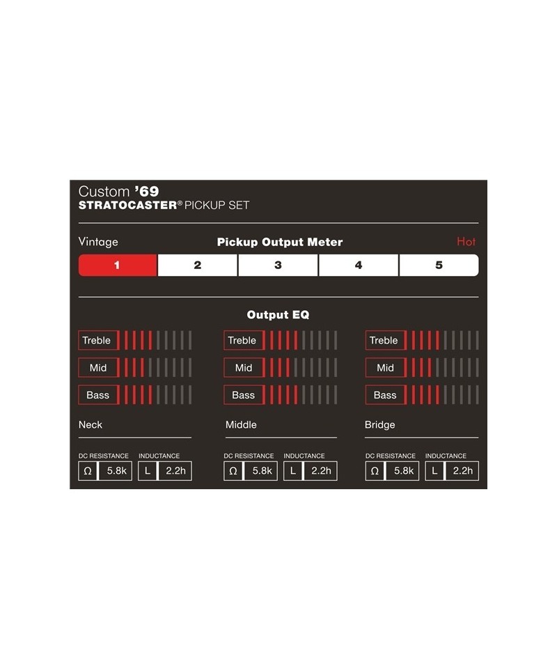 The Single Coil Fender Custom Shop Pickups '69 Strat produce the full and incisive sound that defined rock at the end of the 1960s. Particularly effective with pedals.
