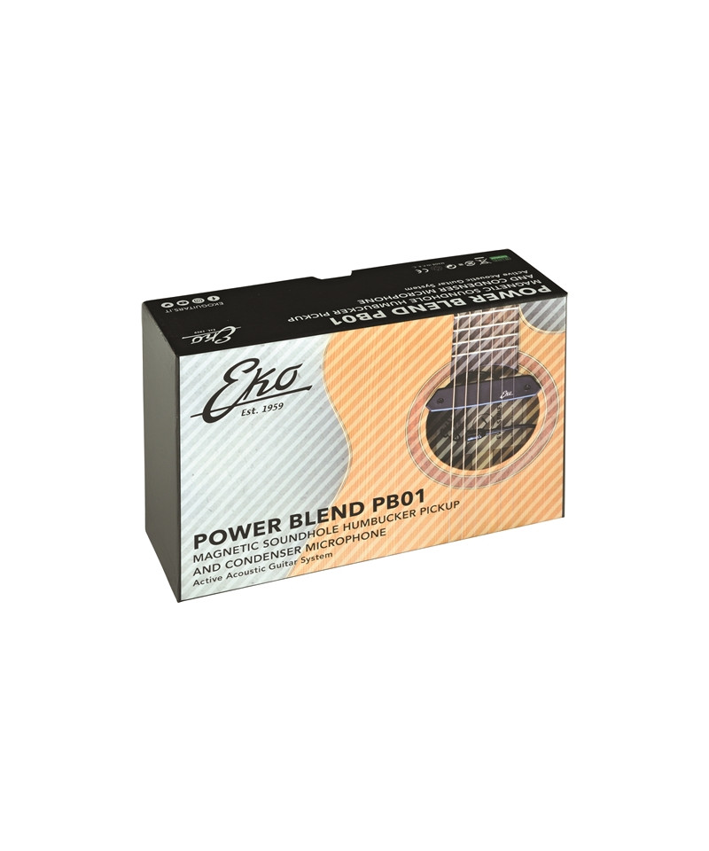 EKO Guitars PowerBend PB01 A pickup with two systems: magnetic (humbucker) and condenser microphone; The function of the magnetic pickup is to collect the sound from the strings during performance, while the microphone, in addition to making the response on the sound of the guitar more faithful, makes it possible to use the guitar as a percussive tool, using the most modern techniques for the instrument. The set of magnetic sound + microphone gives a full, full-bodied, warm and powerful sound. PB01 Suitable for acoustic guitars with a measuring hole from 90mm to 105mm and easy to install, you can install fixed or temporaryly without the need to make changes to the instrument. The 3V battery can be used 105 hours continuously: remember to disconnect the jack whenever the amplified tool is not used.
