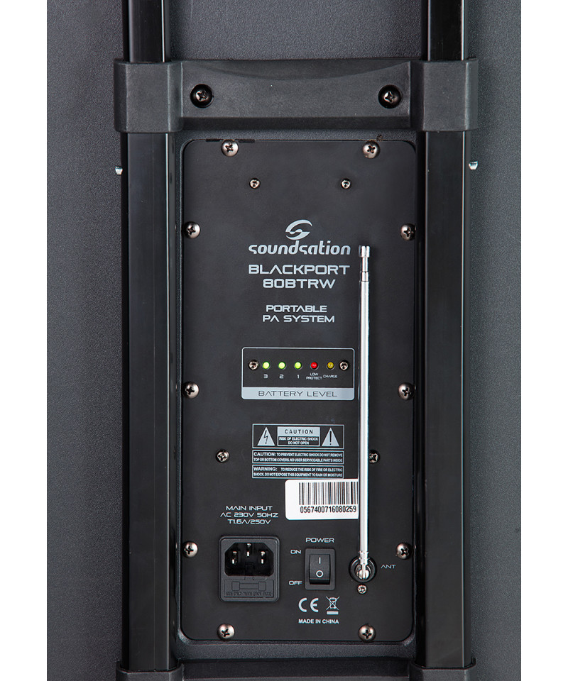 Dedicated to all those who need maximum portability and are constantly on the road, the blackport-80TBRW is a 80W battery PA system with 4-channel mixer, UHF radio microphone, reverb, Bluetooth and MP3 player with SD slot-Card and USB. The batteries have a 6-hour autonomy (at maximum volume and with fully charged batteries). The robust construction with aluminum profiles, the trolley and weight contained (17 kg, batteries included) make it an ideal tool in all those situations on the fly such as parties, shows from one-Man band or small needs of PA without risks of damage and good performance in terms of power and audio quality.