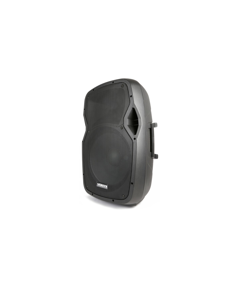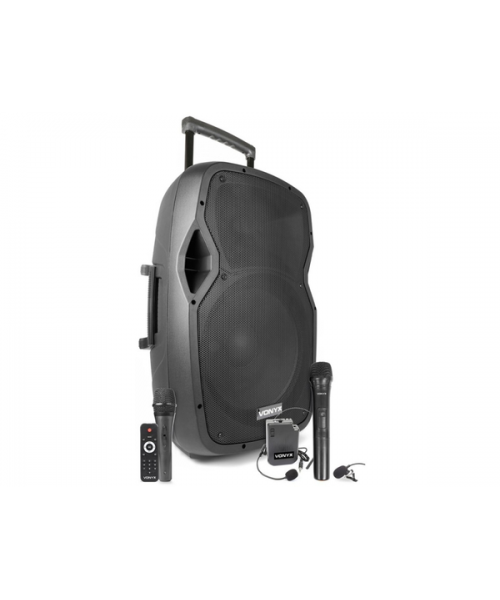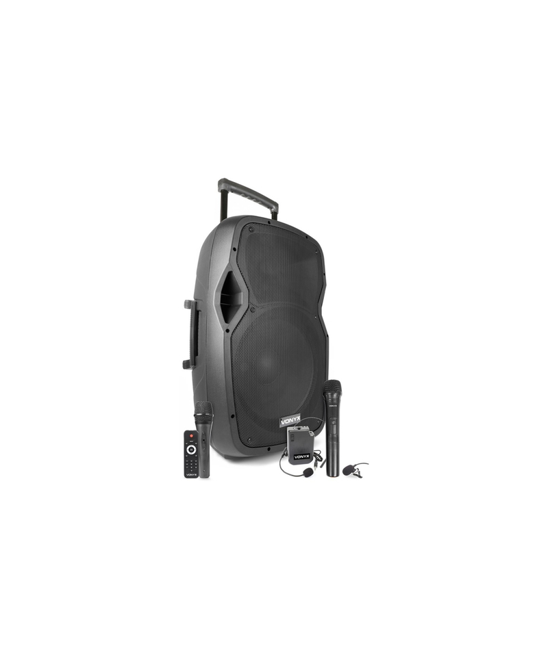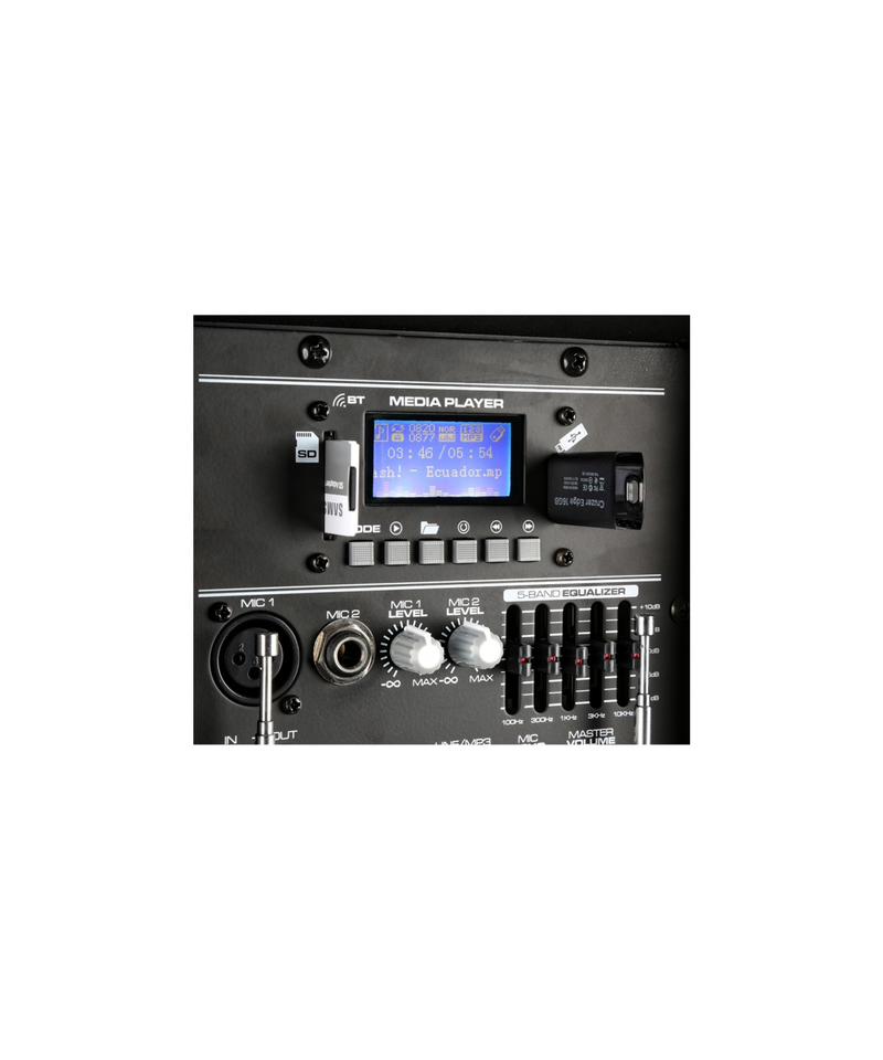 15 "800W professional portable speaker equipped with remote control, USB port and integrated SD card slot for reproducing MP3 files. This system all-in-One equipped with Bluetooth receiver for playing music and wireless UHF bodypack transmitter. It works by power supply or rechargeable 12V rechargeable battery and therefore can be used effectively in outdoor environments. Equipped with removable handle and wheels. In the back there are two microphone inputs and an eco effect for wired microphones, an AUX input, a control panel for MP3, commands for adjusting tones etc. This complete system essential if you are looking for a good quality acoustic reproduction.