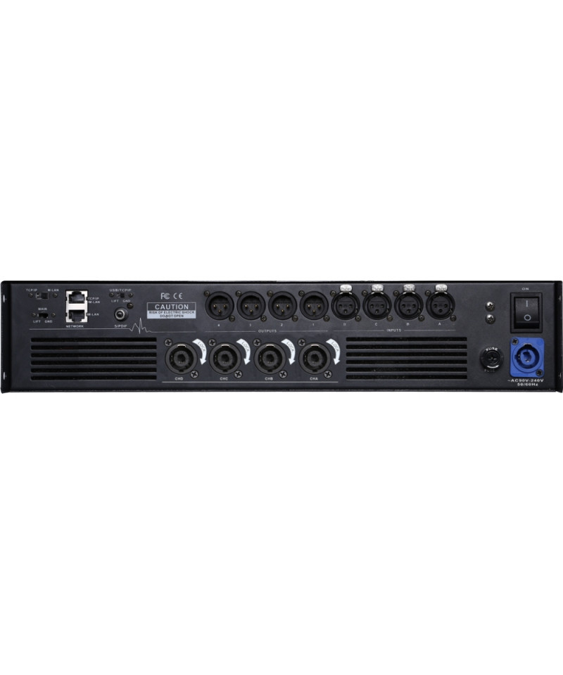 - Outstanding Performance: High Power Output: - 4 x 800w @ 4ohm or 2 x 1400w @ 8ohm (Bridge mode) - Switched-Independent Mode 2 Power Supplies with Double Voltage Automatic Selection - Exit stages in class D with efficiency up to 90% at full load - Complete protection circuits with over-Current, Over / Under-Voltage, DC output and over-temperature - Four processed outputs destined to drive additional poweramplifiers - Excellent sound performance with 24bit high-end converters coupled with 48khz sampling frequency - 4 inputs, 4 outputs with complete matrix mixing