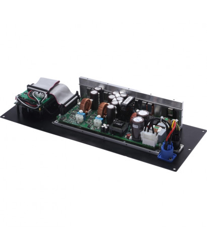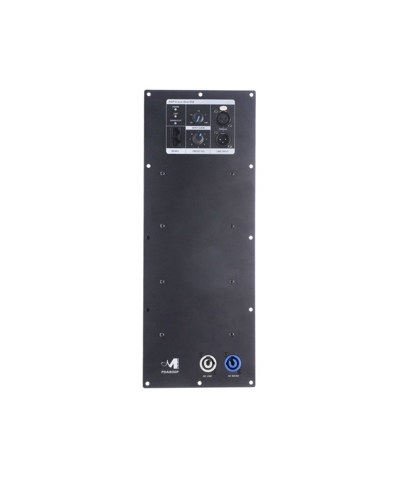 PDA800P is a solution integrated with DSP and amplifier, dedicated to the design of amplified speakers to 1 or 2 ways. Designed to be integrated into different solutions, it provides 2 channels with output power of 800W @ 4 ohms. However the two channels can be placed in bridge in order to obtain a channel at 1400W @ 8 ohm suitable for piloting a subwoofer. Furthermore, it offers a complete set of value-added functionality including the RS485 connection for monitoring and control via dedicated PC software. To ensure maximum reliability and efficiency, PDA800P includes a switch type power supply that supplies power to 2 output channels. The output stages use the class D circuit which allows to obtain low distortion, high efficiency all equipped with a complete set of circuit protection.PDA800P also incorporates a sophisticated digital processor thanks to its powerful DSP a 96KHz 24bit and high-performance 24-bit AD / / converters. Every channel features noise gate fuitions, crossover filters, parametric equalizers for input and output sections, the RMS compressor, the alignment delay and Filters All-Pass, everything needed to optimize a self-propelled speaker. Furthermore, the channel clip / limiter function provides output monitoring to avoid speaker damage with sweet gain reduction in clip threshold, in addition to the efficient heat dissipation system and overheating protection that in turn guarantee reliability outright compromessi.Inoltre The PDA800P is also equipped with a "Dynamic Loudness" function and a useful white / pink noise generator. All the configuration parameters of the DSP functions, the limiter setting and the display of the real-time values are accessible by using the dedicated PC software.