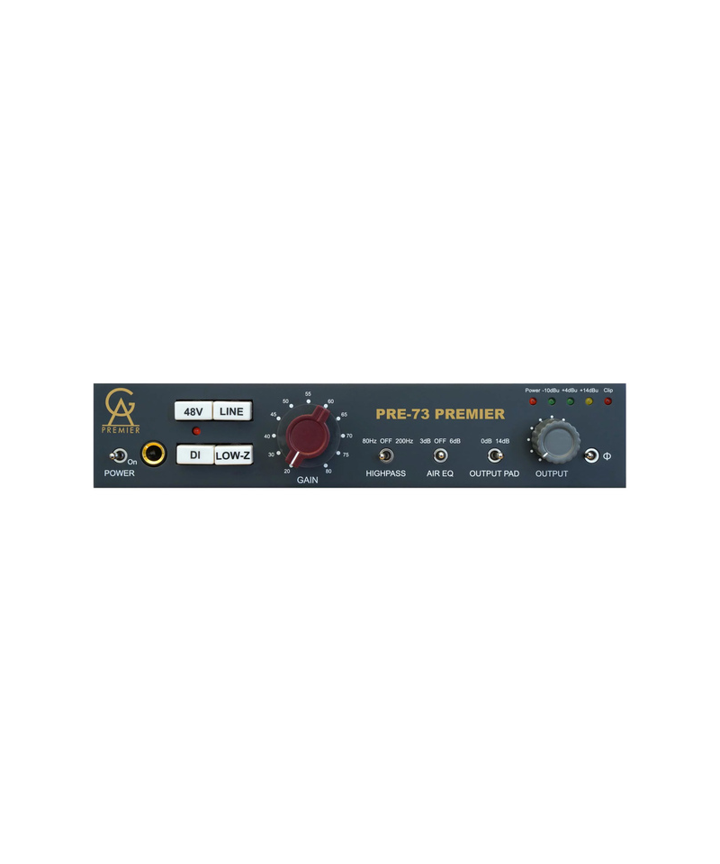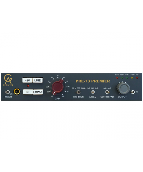 Pre-73 Premier A vintage-style preamplifier for microphone, line and tool to a channel. The signal path uses only discrete components such as resistors, condensers and transistors. The entrance and exit are balanced by the transformer, using two different transformers, each optimized for its purpose. This way the audio components were built before the integrated circuits became available. The circuit used in the pre-73 Premier similar to the preamplifying section of the classic module 1073 with a sound, hot, incisive, sweet and musical. These classic features have been listened to countless recordings over the years and a versatile sound that works very well on most sound sources and in most genres. The essence of this sound now available at a surprisingly low cost, making it available almost to everyone.