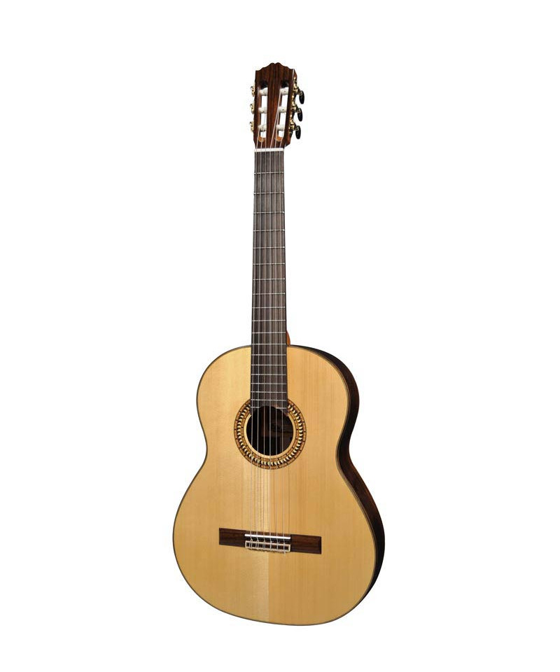 The Salvador Cortez CS-130 oneIdeal classical guitar for the conservatory, made of solid European fir trees, bands and background in Indian solid rosewood, high quality ebony keyboard. The slightly smaller harmonious case offers a sound with even more intimate and clear shades. In addition, the considerable sound projection and dynamic wealth, well-defined and separate sound registers guarantee more security and an immediate sound yield for the study of the academic three-year period in the conservatory and for performances in public.