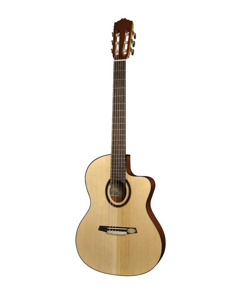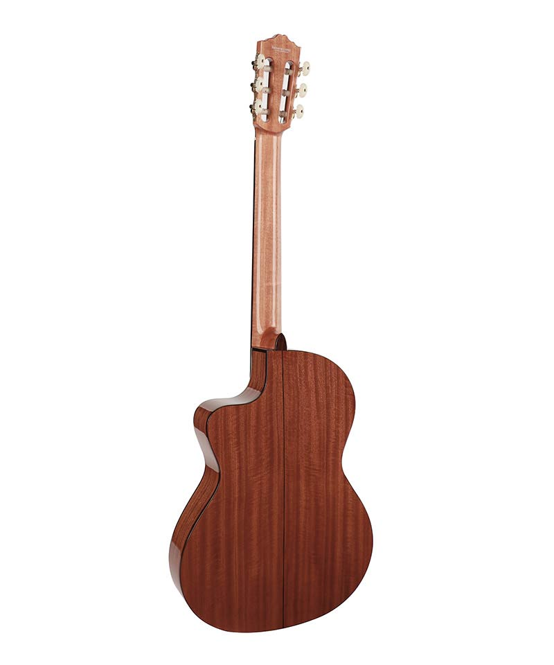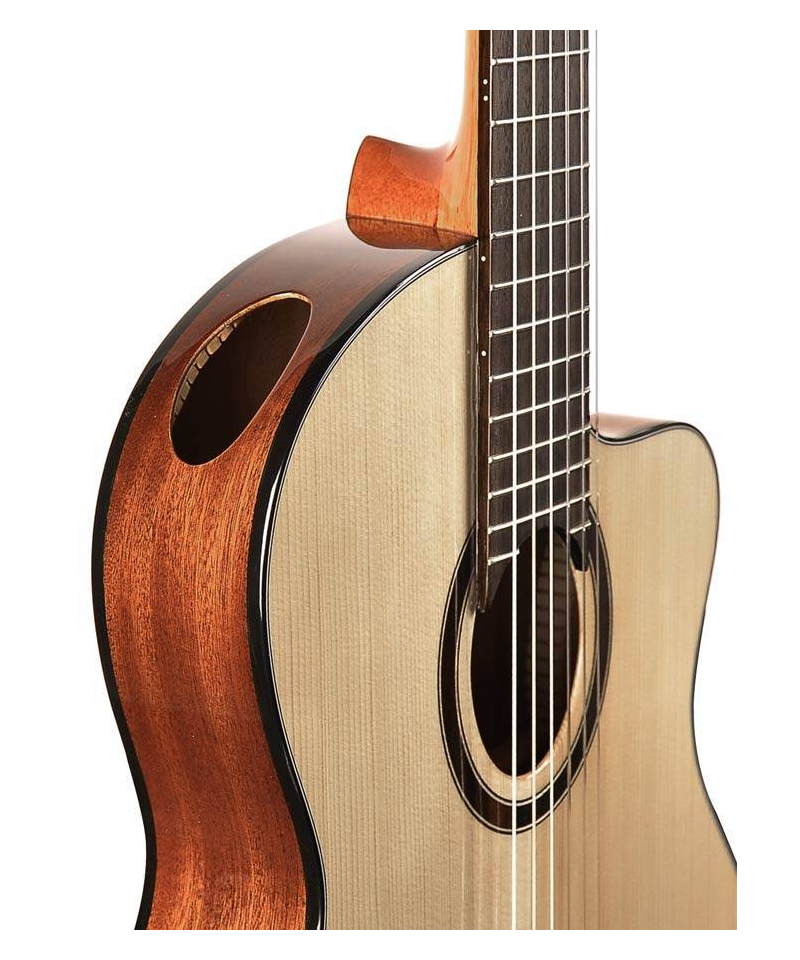 The Salvador Cortez CS-205 oneBLASSIC GUITAR AMPLIFIED WITH MISSING shoulder with 76mm narrow case, designed to allow modern, acoustic or electric guitarist to play with the utmost facility starting to experience the world of classical guitar. Made of high quality European solid spruce and mahogany bottom and bands, it has an additional hole on the upper band that projects the sound directly floating the guitarist compensating the volume reduction made by the narrow case.