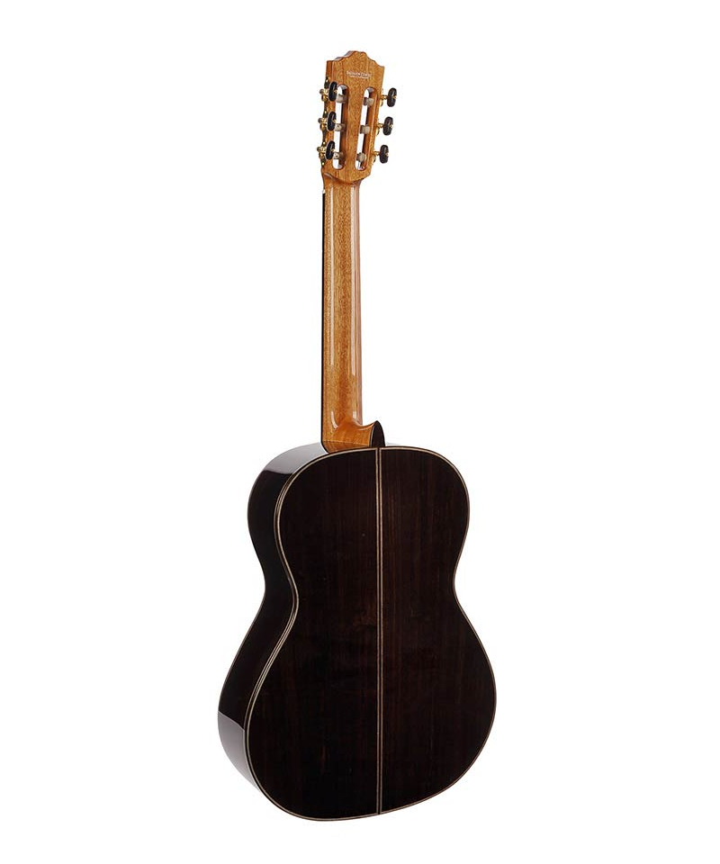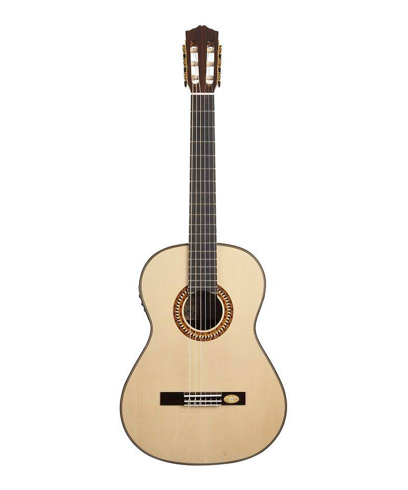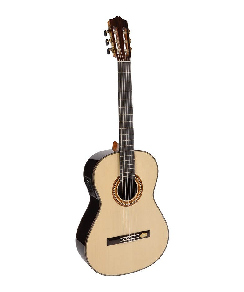 The Salvador Cortez CS-130-E aClassic guitar amplified with full shoulder, made of solid European fir trees, bands and background in Indian solid rosewood, high quality ebony keyboard. Its mission to carry all the sound details of the classical guitar intact, both in the studio and in any context where lakeside is not enough. Electrified with a piezo + microphone preamplification systemFishman Presys BlendEquipped with a built-in tuner.