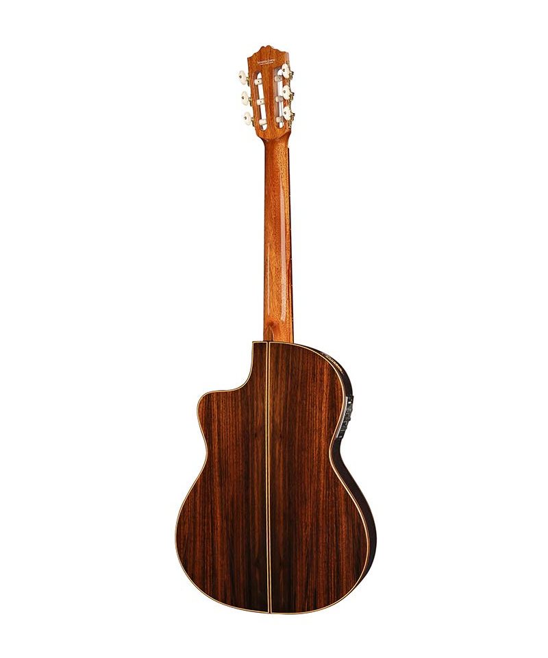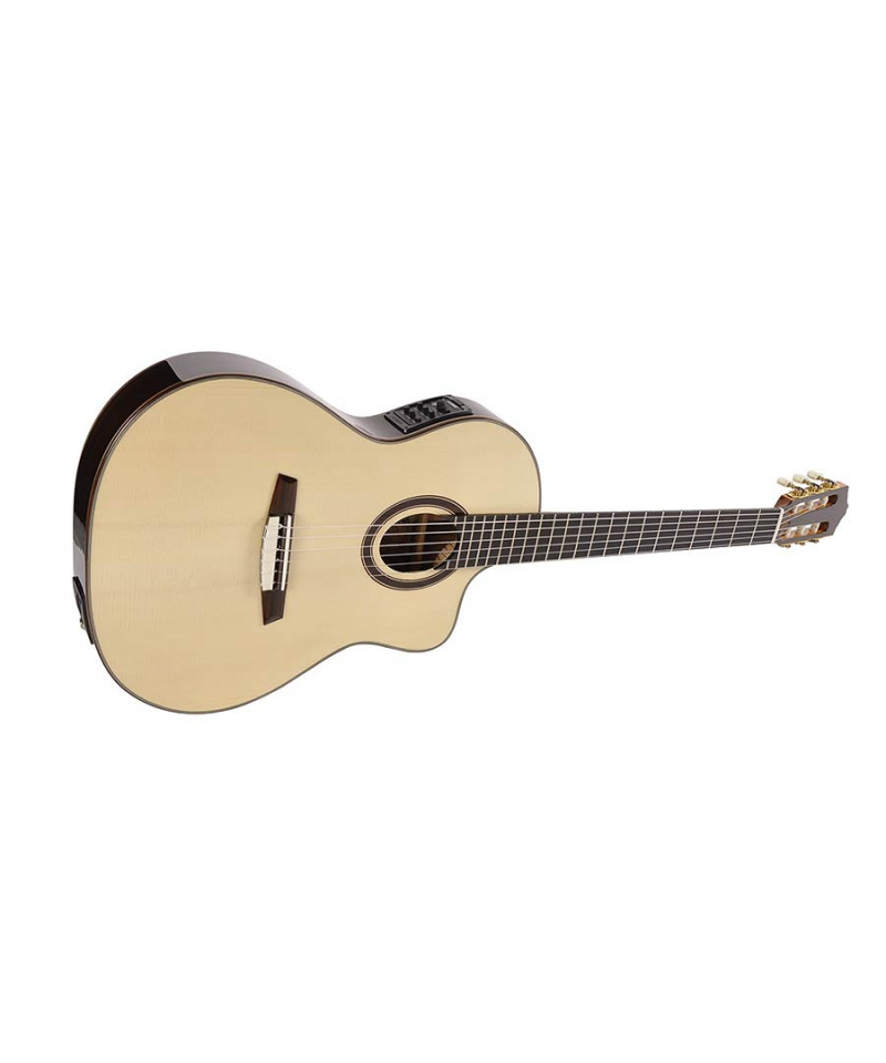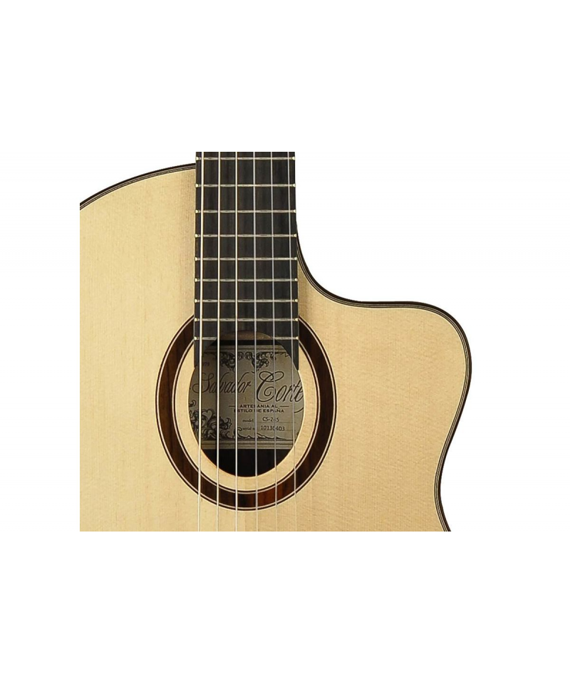 The Salvador Cortez CS-245 oneBLASSIC GUITAR AMPLIFIED WITH MISSING shoulder with 76mm narrow case, designed to allow modern, acoustic or electric guitarist, to combine ease of use and a superior sound yield both in the studio and during live. Made in solid European fir, Indian rosewood background and rosewood bands and high quality ebony keyboard, it has an additional hole on the upper band that projects the sound directly to the guitarist compensating the volume reduction made by the case Narrow. Amplified with piezo pickup system with internal microphone capable of returning a faithful and rich sound of harmonics.