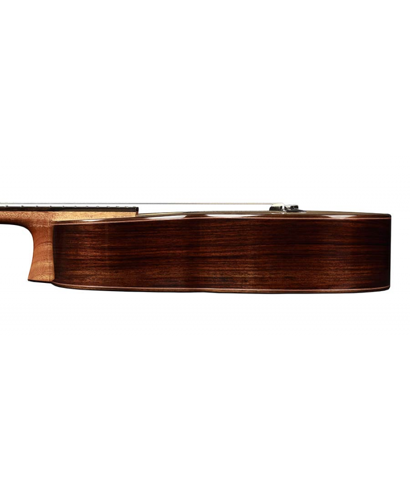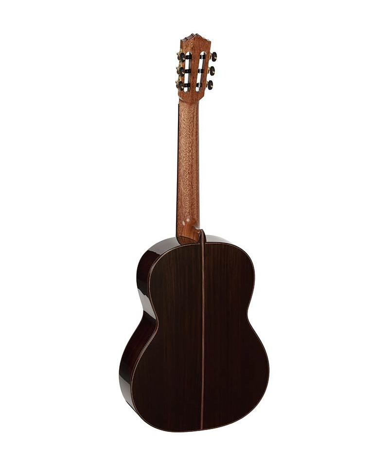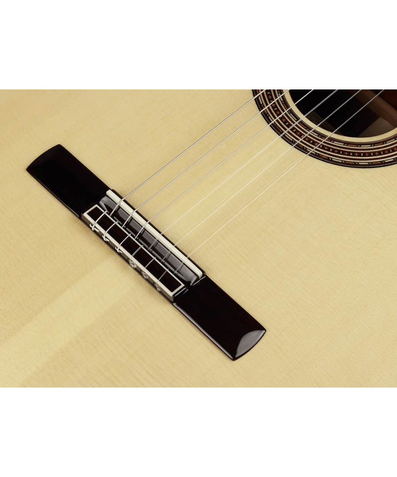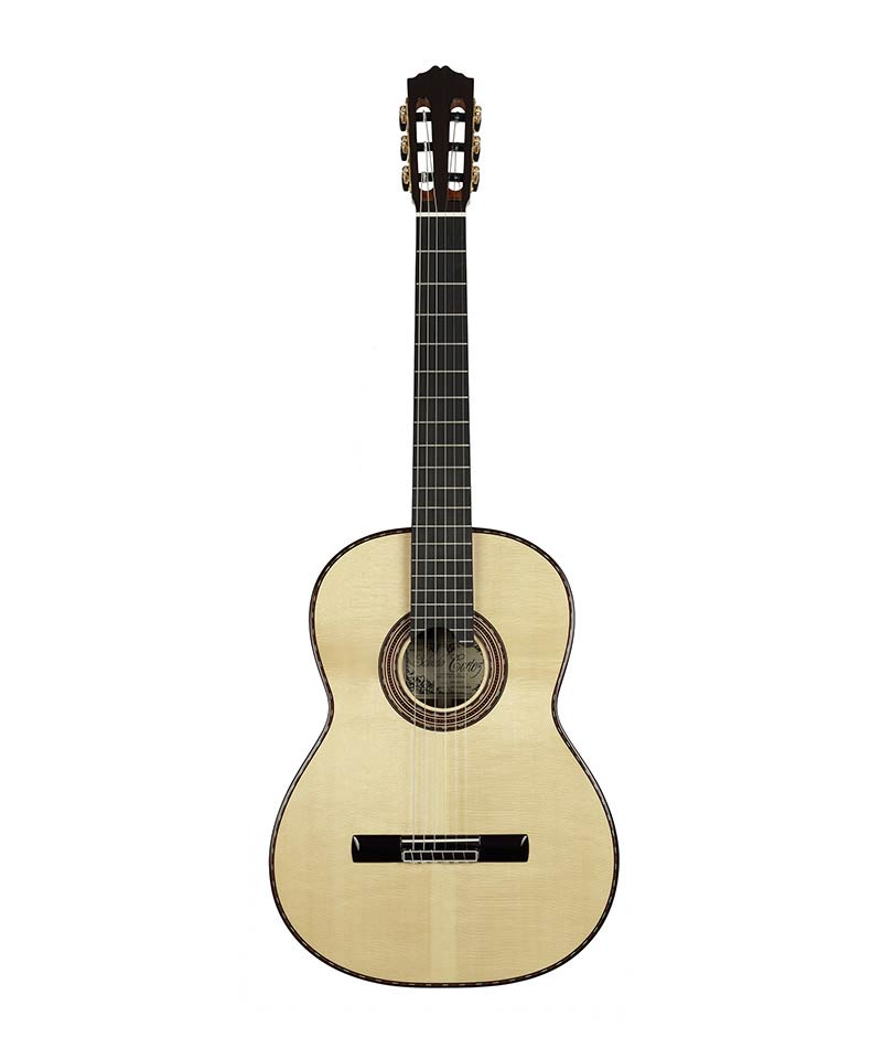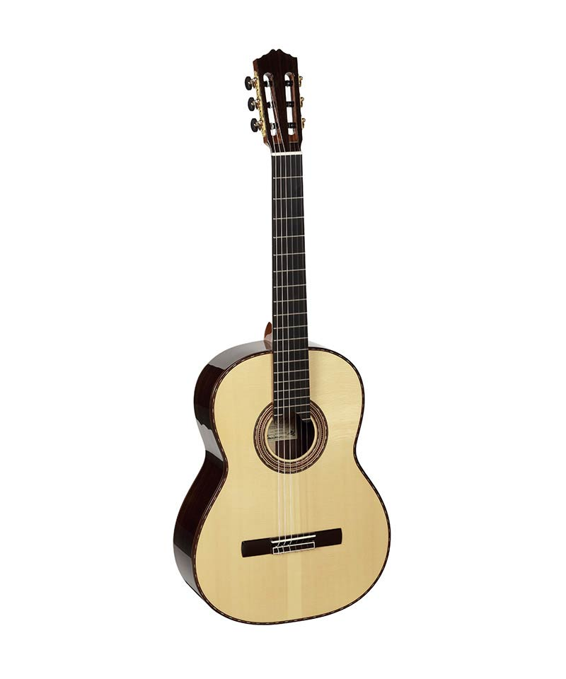 Classic 4/4 guitar with raised keyboard with harmonic top in solid engelmann fir, solid rosewood background and rosewood, keyboard and ebony bridge, headboard and sleeper in bone, modern latex chain Bracing. Equipped with an elegant and sturdy Deluxe padded bag.