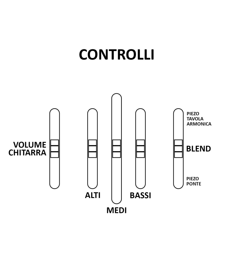 - Eqs: Godin Custom with Volume / Treble / Mid / Bass / Blender control