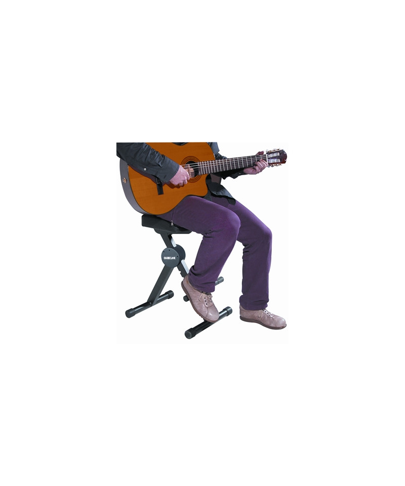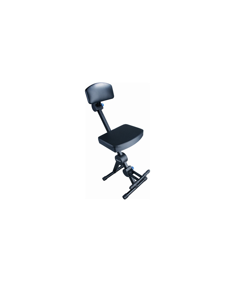 Stool for musicians with seat, backrest and footrest adjustable in height with extreme facility and agility, pulling the blue knob and pushing the side to be adjusted up or down.