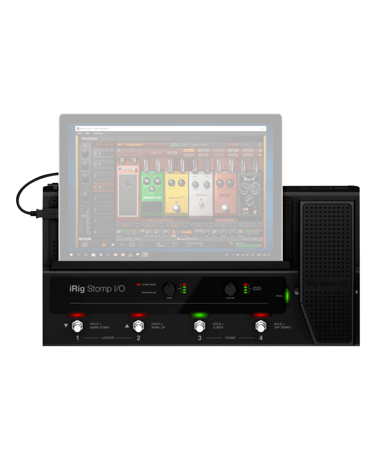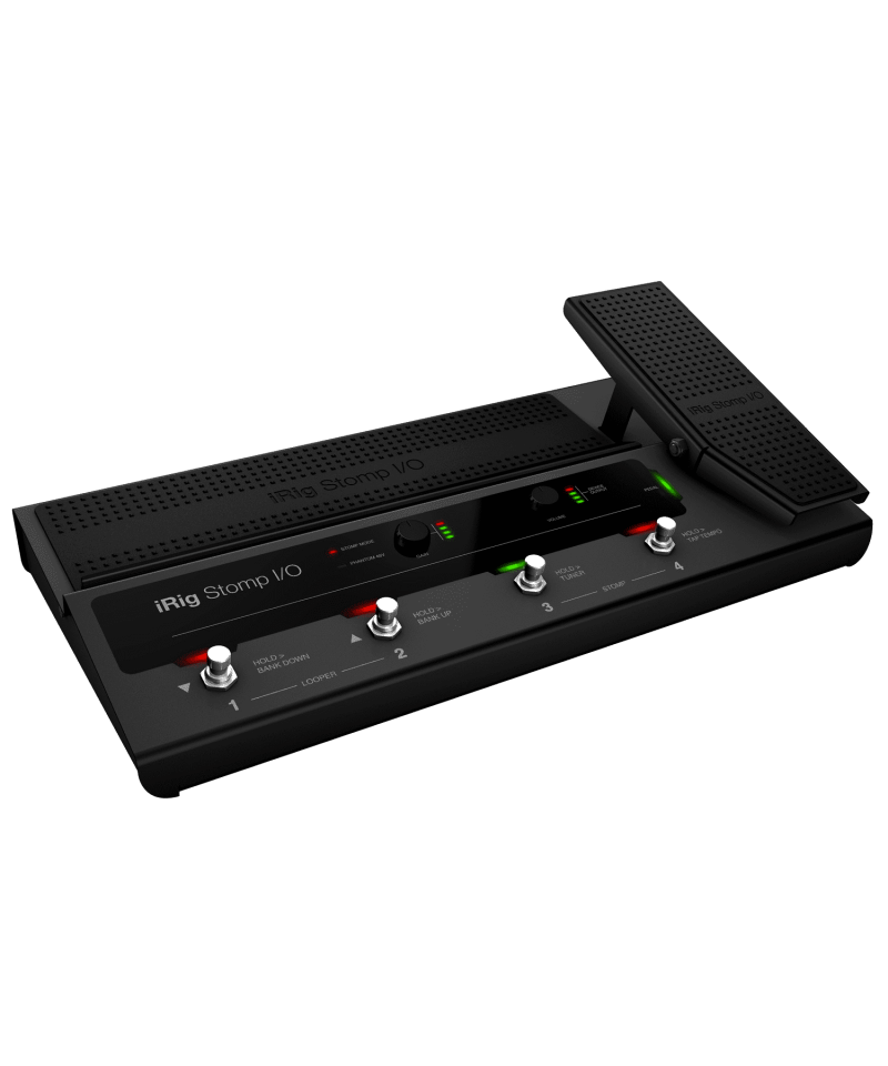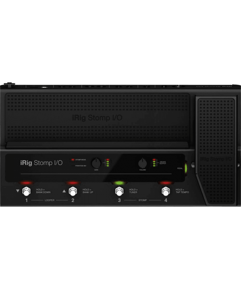 IRIG STOMP I / O A new type of USB controller pedaling that integrates a high resolution MFI certified professional audio interface with MIDI input / output for iPhone, iPad, Mac and PC. It is supplied bundled with a guitar processing unit, cutting-edge voice and a recording software for a flexibility and a usability both live and in the studio. Solid and robust, but easily transportable, IRIG STOM I / O equipped with four metal footswitches plus an expression pedal with a switch, all with LED indicators. To further extend its possibilities of control, it can connect up to 2 additional switches or pedals. MIDI IN / OUT ports make continuous control of external processors when the IRIG STOP I / O is used as a MIDI Stand pedal-Alone, without any device or computer connected to it. The Neutrik Combo Jack 1/ 4 "XLR accepts tools and microphones, including capacitor microphones with switchable Phantom 48V power supply. The balanced stereo output connects to an external amplifier, mixer or PA and a stereo headphone output from 1/ 4 "Available to monitor in silence. The gain entry and output volume knobs are easily accessible on the front panel, each with the VU indicator-Dedicated Meter LED, for a simple and rapid setup of levels