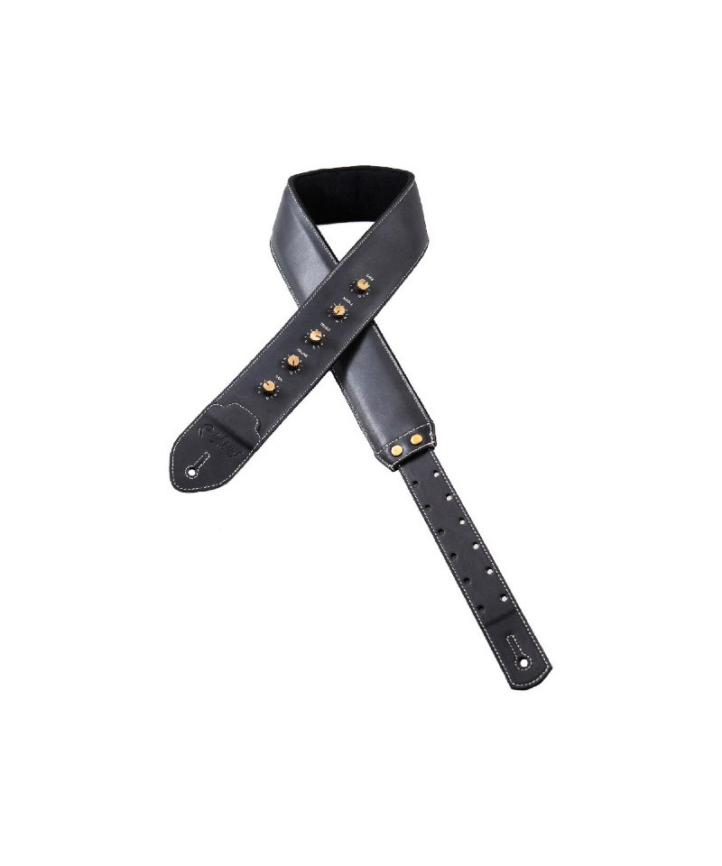 High quality cowhide shoulder strap and latex padding with microfbra, RAS adjustment system, built-in plettri door, characterized by 5 metal knobs in guitar style amp. Black color, width 6 cm, adjustable length from 95 cm to 150 cm.