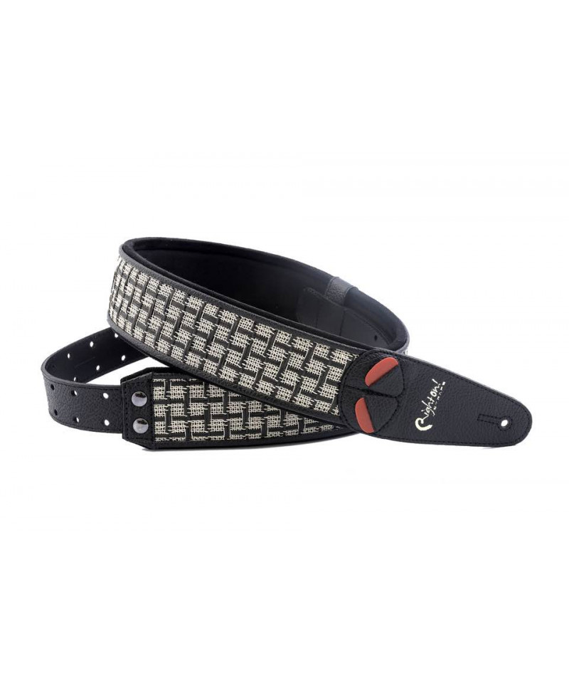 Handmade shoulder strap with high-tech ecological materials respectful of the environment and free of any animal tissue, characterized by finishes cured in every detail, decorations that resume the fabrics used in the fronts of the classic amplifiers, padding in High density latex (5 mm), RAS adjustment system, built-in plettri holder. Black / gray color, width 6 cm, adjustable length from 95 cm to 143 cm, ultra light. Indicated for guitar and bass.