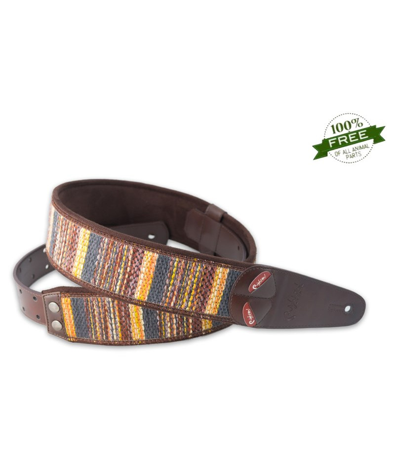 Handcrafted shoulder strap with high-tech ecological materials respectful and devoid of any animal tissue, characterized by finishes married in every detail, declaration in South American style, high density latex padding (5 mm), system of RAS adjustment, built-in plettri holder. Brown color, width 6 cm, 95 cm adjustable length to 143 cm, ultra light. Indicated for guitar and bass.