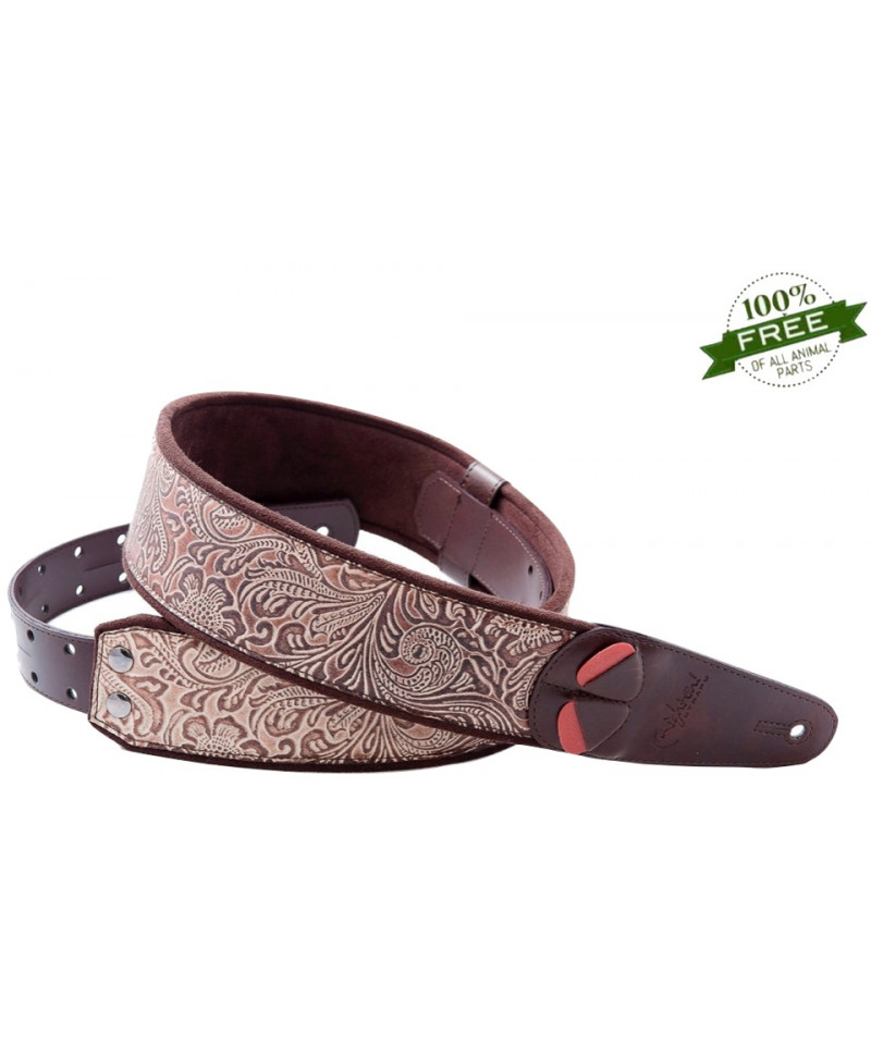 Handmade shoulder strap with high-tech ecological materials respectful and devoid of any animal tissue, characterized by finishes cured in every detail, microfibre coating decorated with floral and aged motifs handcrafted, padding in High density latex (5 mm), RAS adjustment system, built-in plettri holder. Beige color, width 6 cm, 95 cm adjustable length to 143 cm, ultra light. Indicated for guitar and bass.