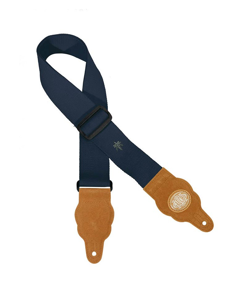 Shoulder strap for guitar, in hemp, dark blue color, brown straps.