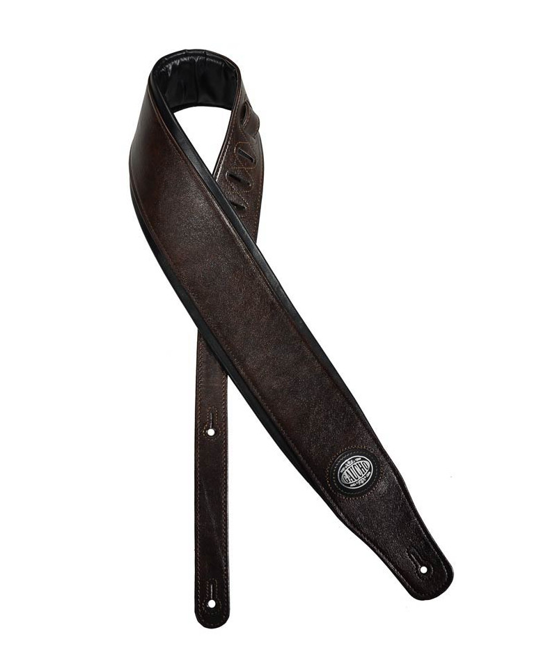 Guitar shoulder strap, dark brown color with black upholstered retro.