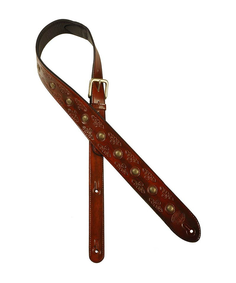 Shoulder strap for guitar, in worked leather, brass buttons, cognac