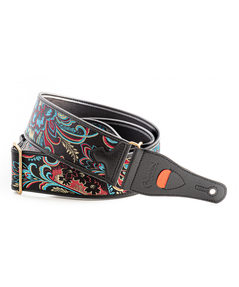 Shoulder strap created in a crafted way with ecological materials, environmentally friendly and free of any animal tissue, characterized by incredible lightness, high comfort and finishes taken care of in every detail. Upper finish in floral texture. Built-in plettri door. Black color, width 6 cm, adjustable length from 86 cm to 150cm. Indicated for guitar.