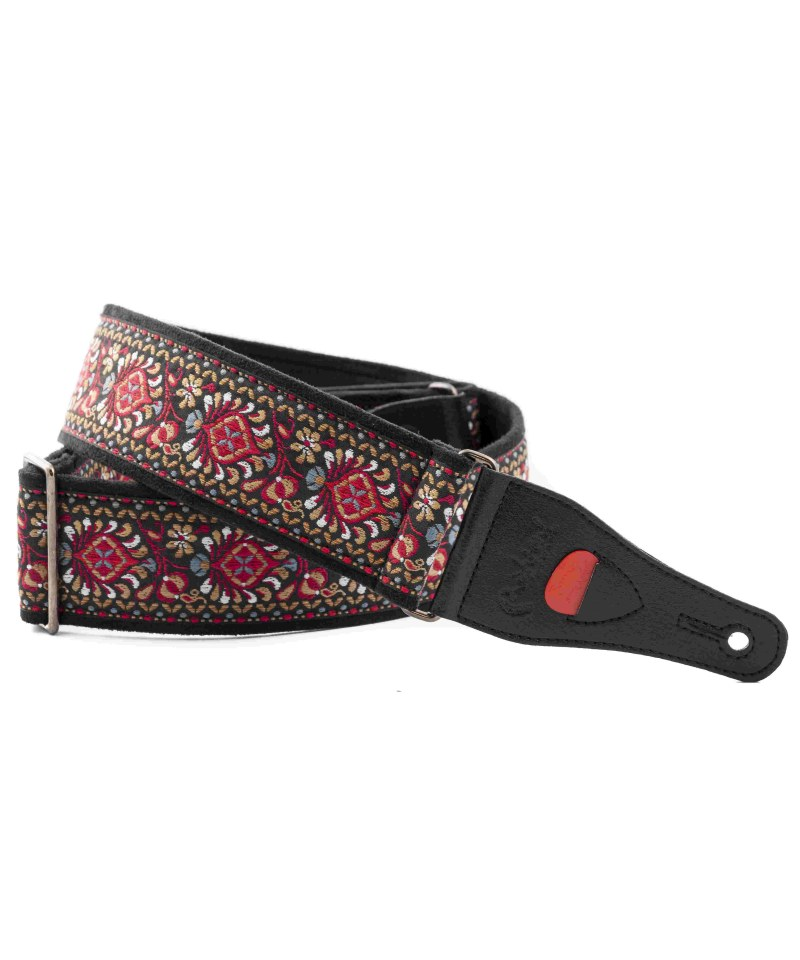 Fabric shoulder strap decorated with a vintage abstract motif, covered with microfibre, high quality leather extrit. Light brown color, width 5 cm, adjustable length from 86 cm to 150 cm. Indicated for guitar and bass.