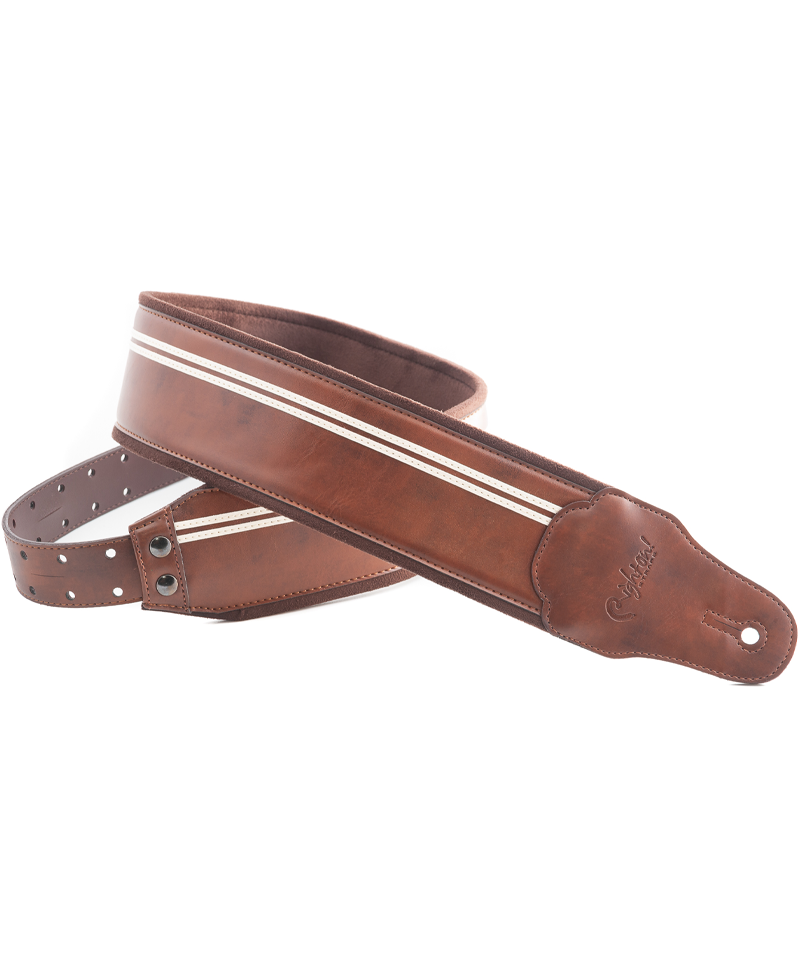 Handcrafted shoulder strap with high-tech ecological materials respectful of the environment and devoid of any animal tissue, characterized by finishes cured in every detail, white decorations, high density latex padding (5 mm), RAS adjustment system, built-in plettri holder. Brown color, width 8 cm, adjustable length from 98 cm to 153 cm, ultra light. Indicated for guitar and bass.