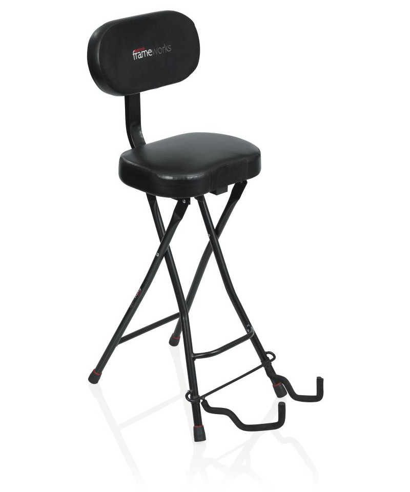 The completely foldable design with quick release pin simplifies closure and storage. If the available space is minimal, simply remove the backrest for a completely compact solution. The shaped base is designed to hold the guitar firmly while the rubber padding prevents scratches or finishing scratches. The red safety rings on the feet add a touch of visibility in the dark to avoid stumbling. Just remove the rings for a more elegant and discreet presentation.