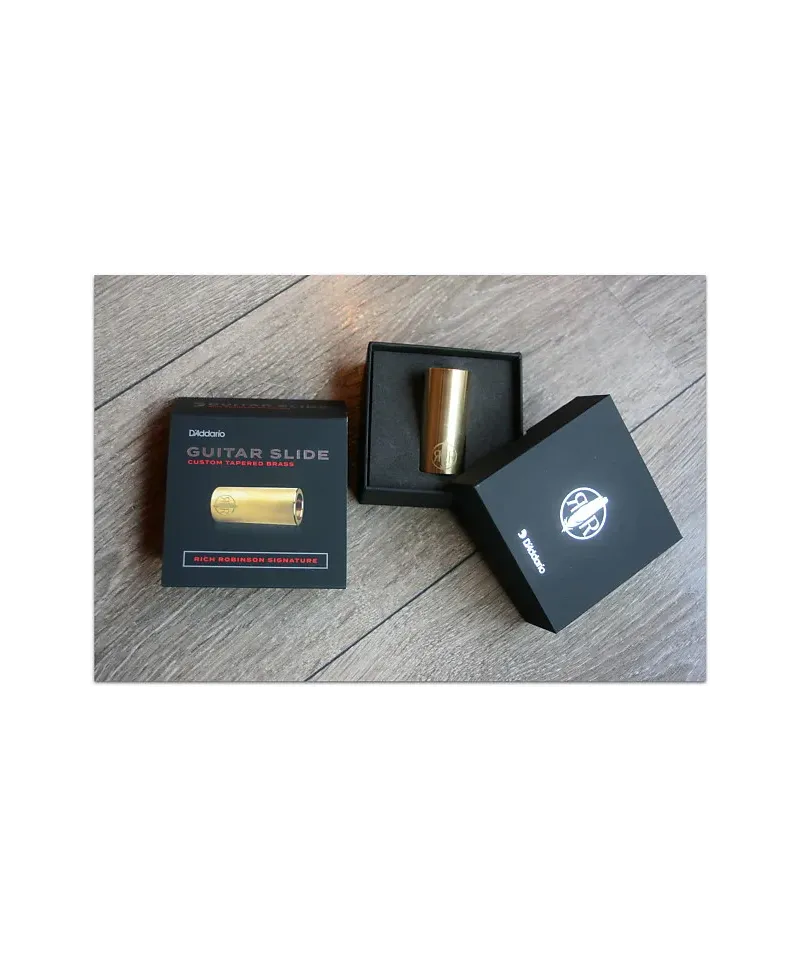D'Addario worked with Rich Robinson of "The Black Crowes" to create a new and unique brass slide. The Rich Robinson Signature brass slide offers you the sharp and bright tone of a brass slide with a unique taper inside, making the slide comfortably to your finger. This taper helps prevent the slide from moving, offering the player more control and comfort while running