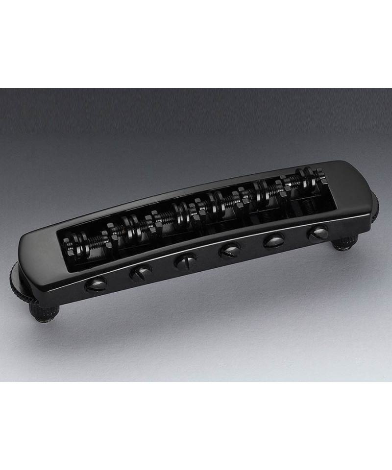 Bridge for electric guitar, chromed black, suitable for use with tremolo, spacing 10.6mm, Radium 14. High-level bridge for les pault guitars. Compatible with spacing between 74.0 and 74.5 mm, adjustable in height, intonation and distance between the strings. Equipped with low friction brass saddles for excellent stability, perfect for Bigsbyt bridges. It is supplied with two different types of saddles: V for the high ropes, a U for low ropes. Technical specifications: Distance Height Adjustment Screws 74 - 74.5mm, string spacing E-and 48.5 - 57.5mm, String Spacing Individual 9.7 - 11.5mm, String Radius 12 (Usable for Fretboard 12-16 Inch), Minimal G / D String Height Above Body 12.5mm, Maximum String Gauge 52, Weight 58g (90g with Accessories), for Lefty: No