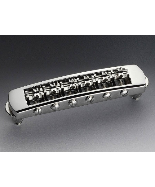Bridge for electric guitar, in Nickel, suitable for use with tremolo, spacing 10.6mm, Radium 14. High-level bridge for les pault guitars. Compatible with spacing between 74.0 and 74.5 mm, adjustable in height, intonation and distance between the strings. Equipped with low friction brass saddles for excellent stability, perfect for Bigsbyt bridges. It is supplied with two different types of saddles: V for the high ropes, a U for low ropes. Technical specifications: Distance Height Adjustment Screws 74 - 74.5mm, string spacing E-and 48.5 - 57.5mm, String Spacing Individual 9.7 - 11.5mm, String Radius 12 (Usable for Fretboard 12-16 inch), minimal g / d string height abbove 12.5mm body, maximum string gauge 52, weight 58g (90g with accessories), for lefty: no.