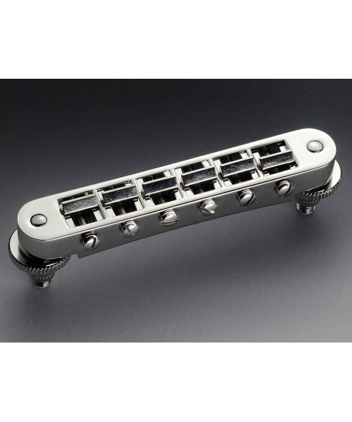GTM Tune bridge-or-Matic for electric guitar, 10.5mm spacing, Radius 14, Nickel. Suitable for electric guitars such as Les Pault, even in a lack of version. Technical Specification: Distance Height Adjustment Screws 74 - 74.5mm, String Radius 12 (Usable for Fretboard 12-16 Inch), Minimal G / D String Height Above Body 13.7mm, Weight 53g (70g with Accessories), For Lefty: Yes