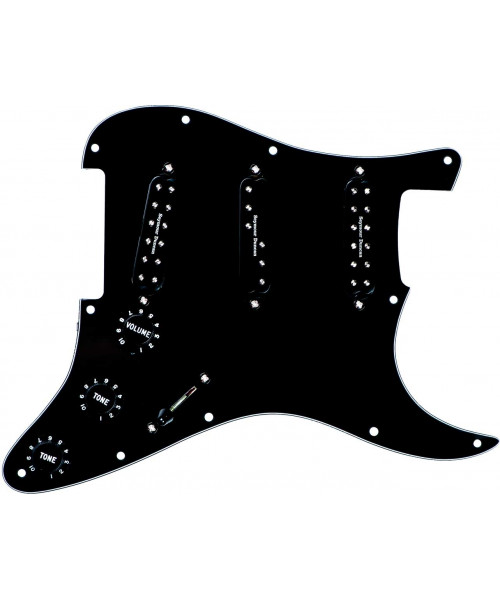 The Everything Ax set for Strat and Liberator System, pre-Loaded Into either at White or Black, Three-Ply Pickguard That Will Add Ton of Versatility to your guitar. This 3 pickup set Will Turn your Strat Into The Ultimate Versatile Workhorse Guitar With Its Wide Variety of Tonal Options. The JB Jr. Bridge Model Will Take Your Strats Bridge Position to Whole New Level. This High Output Single Coil Sized Humbucker Will Give You Nice Crunchy Chords, and Screaming Lead Tone With That Classic Upper Midrange Cut. There Will be tons of Bright Harmonic Sparkle, and at tight focused low end. The Middle Position DuckBucker Ther to Add That Sparkly Single Coil Tone In Positions 2, 3, & 4. Its Unique, Split-Pole Pattern with 3 Poles on Each Coil Also Contributions to The Single Coil Bounciness and Snappy Low End. The Little 59 In The Neck Position Has A Nice, Balanced P.A.F.-like Response for Big, Full Chords, and Fat, Punchy Solos. Has That Pleasing Blend of Warmth and Bite when you dig in. Any future pickup changes you decides to make will be a snap becuase this pickguard comes equipped with free solder solderless system that makes swapping pickups fast and easy. Hand Built in Santa Barbara, CA, These Pickups like with a 4-Conductor Lead Wire, and are Wax Potted for Squeal Free Operation. The Pots, Selector Switch, and Cap, Are All High Quality, And We Use Vintage Style Cloth Push Back Wire For All of The Connections. Available with either at black or white 3-PLY PICKGUARD THAT FEATURES AN 11-SCREW HOLE USA Pattern.