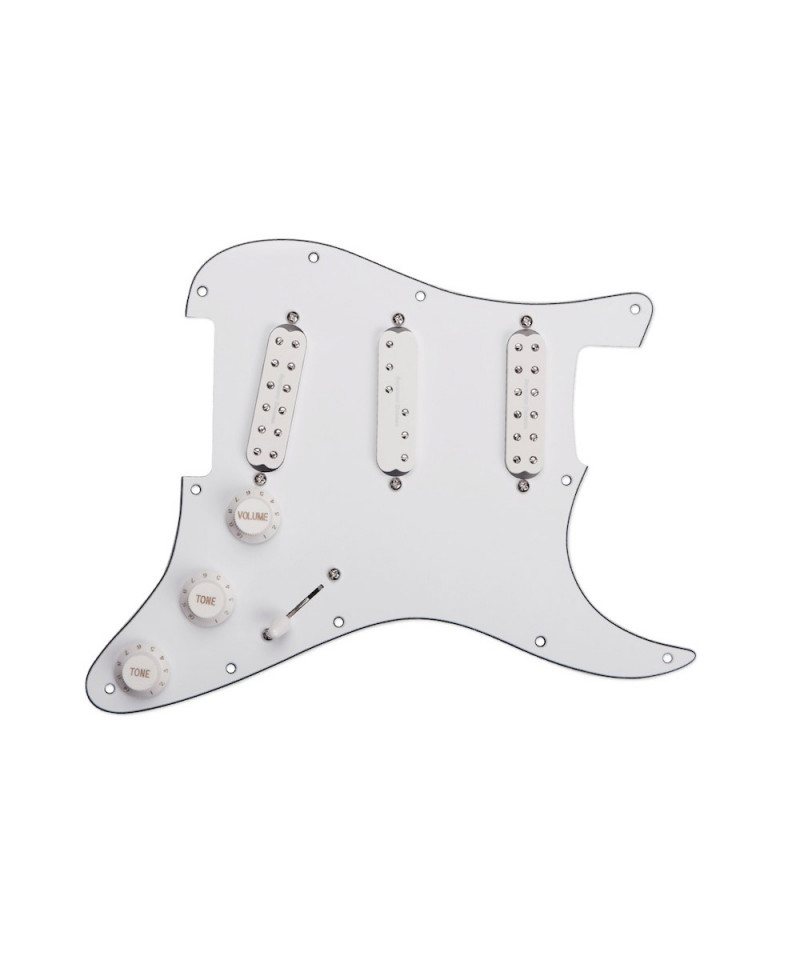 The Everything Ax set for Strat and Liberator System, pre-Loaded Into either at White or Black, Three-Ply Pickguard That Will Add Ton of Versatility to your guitar. This 3 pickup set Will Turn your Strat Into The Ultimate Versatile Workhorse Guitar With Its Wide Variety of Tonal Options. The JB Jr. Bridge Model Will Take Your Strats Bridge Position to Whole New Level. This High Output Single Coil Sized Humbucker Will Give You Nice Crunchy Chords, and Screaming Lead Tone With That Classic Upper Midrange Cut. There Will be tons of Bright Harmonic Sparkle, and at tight focused low end. The Middle Position DuckBucker Ther to Add That Sparkly Single Coil Tone In Positions 2, 3, & 4. Its Unique, Split-Pole Pattern with 3 Poles on Each Coil Also Contributions to The Single Coil Bounciness and Snappy Low End. The Little 59 In The Neck Position Has A Nice, Balanced P.A.F.-like Response for Big, Full Chords, and Fat, Punchy Solos. Has That Pleasing Blend of Warmth and Bite when you dig in. Any future pickup changes you decides to make will be a snap becuase this pickguard comes equipped with free solder solderless system that makes swapping pickups fast and easy. Hand Built in Santa Barbara, CA, These Pickups like with a 4-Conductor Lead Wire, and are Wax Potted for Squeal Free Operation. The Pots, Selector Switch, and Cap, Are All High Quality, And We Use Vintage Style Cloth Push Back Wire For All of The Connections. Available with either at black or white 3-PLY PICKGUARD THAT FEATURES AN 11-SCREW HOLE USA Pattern.