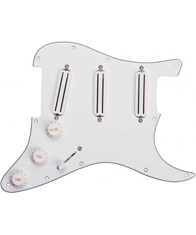 With Three Ferocious Hot Rails Pickups and The Liberator System, This Prewired Stratocaster Pickguard Turns Any Strat Guitar Into A Fire-Breathing Beast. This prewired stratocaster Pickguard Assembly Comes with the high-Octane Triple Rails Pickup Set, That Includes Three of Our High Output Hot Rails Pickups. IT Will Turn your Strat Into at Beast With Huge Humbucker Tones That No other pickups can delivery. Chords Will Be Crunchy, With Lots of Midrange Harmonics, And Leads Will Scream. Any Future Changes You Choose To Make Will Be A Snap With The Liberator Solderless System Its Screw-ClamP Connector Accepts Bare or Tinned Pickup Leads. Simply Use The Provided Screwdriver to Tighten The Connector for Torqued-Tight Tone. Future pickup changes are fast and solderless. We use The Highest-Grade Pots, Switches and Jack Components on This Pickguard to Give Your Guitar An Instant Electronic Upgrade. Hand Built in Santa Barbara, CA, These Pickups All Use at Ceramic Bar Magnet, like with a 4-Conductor Lead Wire, and are Wax Potted for Squeal Free Operation. The Pots, Selector Switch, and Cap, Are All High Quality, And We Use Vintage Style Cloth Push Back Wire For All of The Connections. This white, 3-Ply Stratocaster Pickguard Uses An 11-SCREW HOLE USA Pattern.