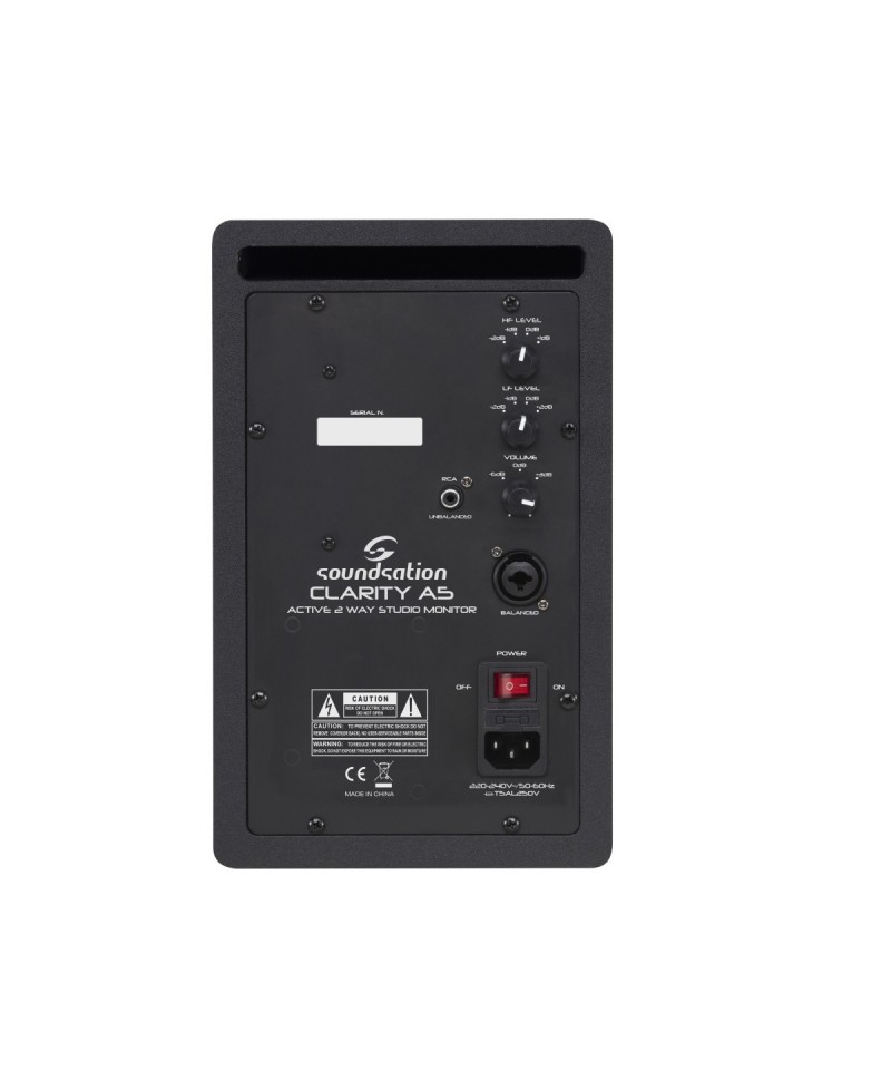 The Clarity A5 studio monitor is part of the new Clarity Monitor study line and an optimal solution for both home recording and for the study. The technological implementation makes these monitors ideal for a high-level listening thanks to the response in linear frequency and to the adjustment possibility for high and low frequencies. The wide choice of inputs positioned in the rear panel (XLR, TRS, RCA), guarantees the simplicity of use. The modern and refined design and the satin black finish make this studio monitor elegant and suitable for many rooms.