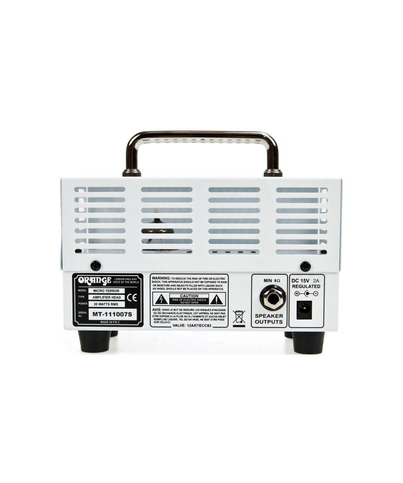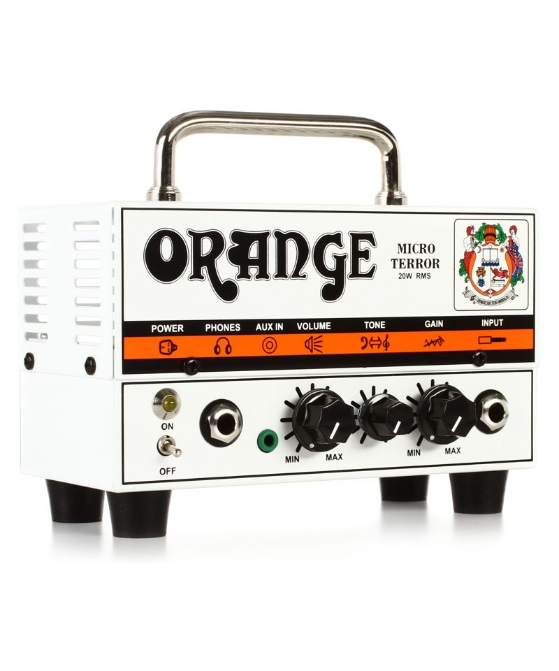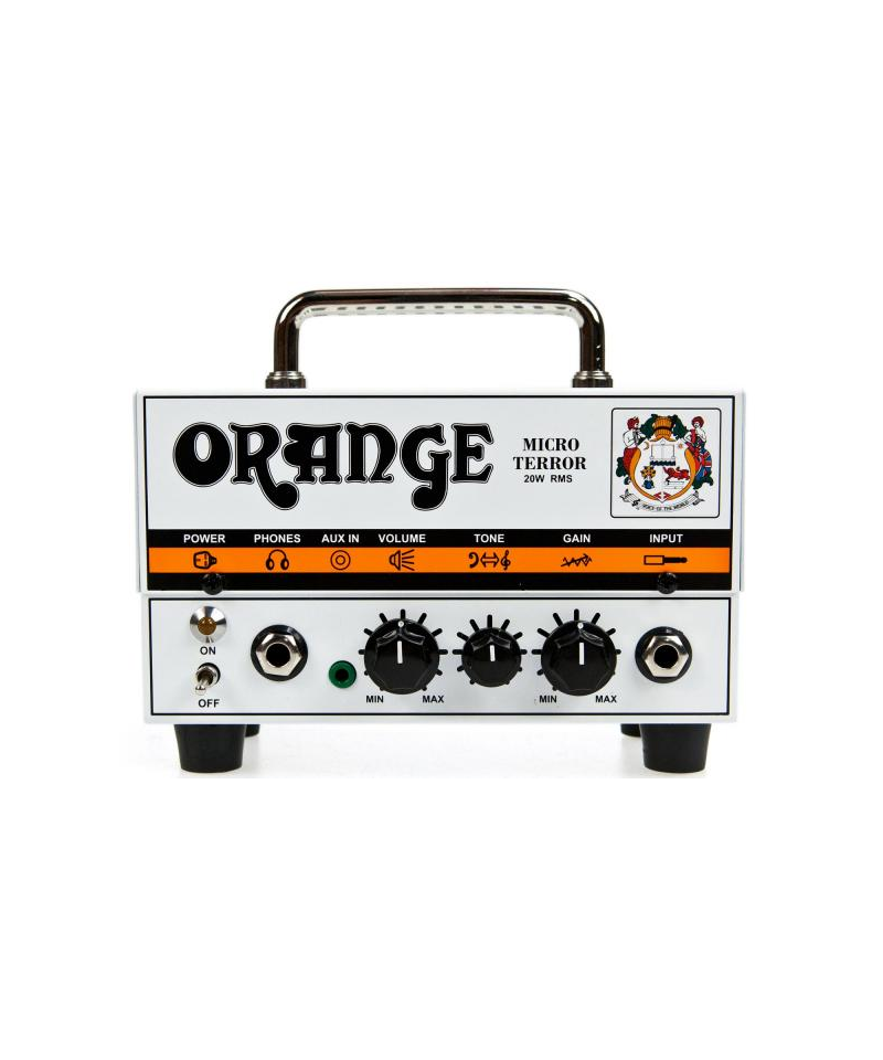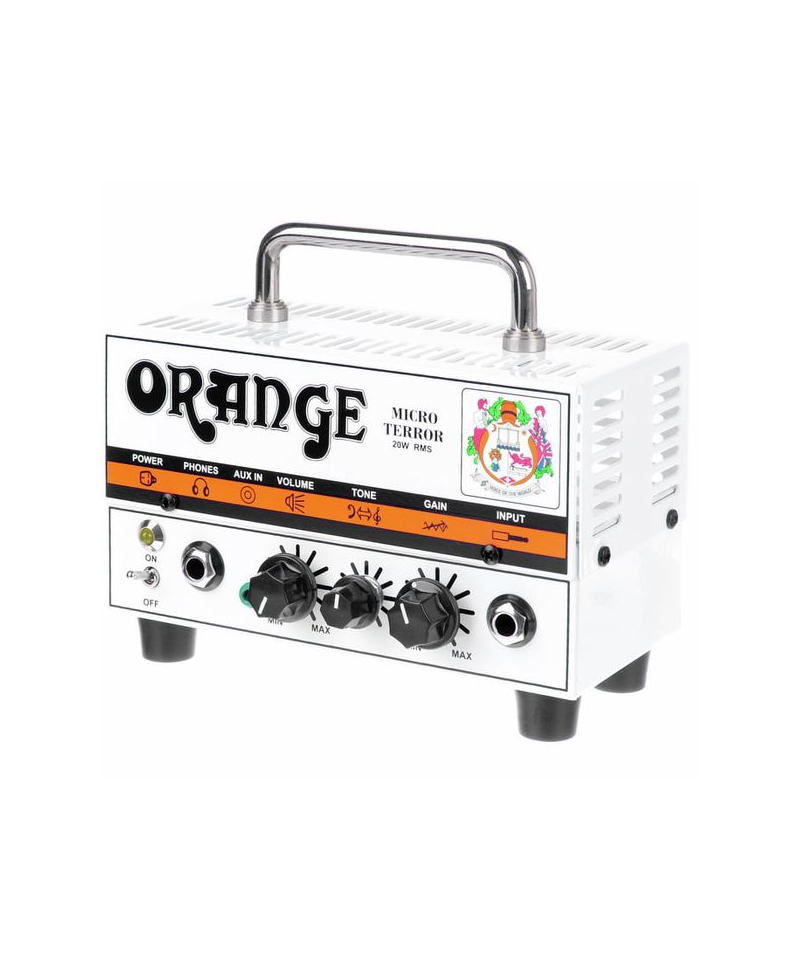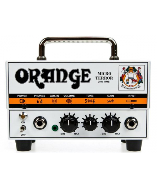 The extremely small Orange micro terror guitar head but can provide an incisive sound. The hybrid design of this amplifier has a 12AX7 valve preamplifier and a 20 watt MOSFET final. A headphone output and an input for the MP3 / CD player make this feel perfect for practicing.