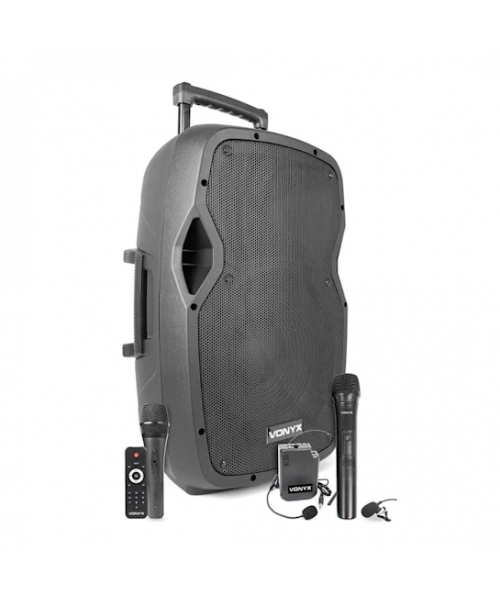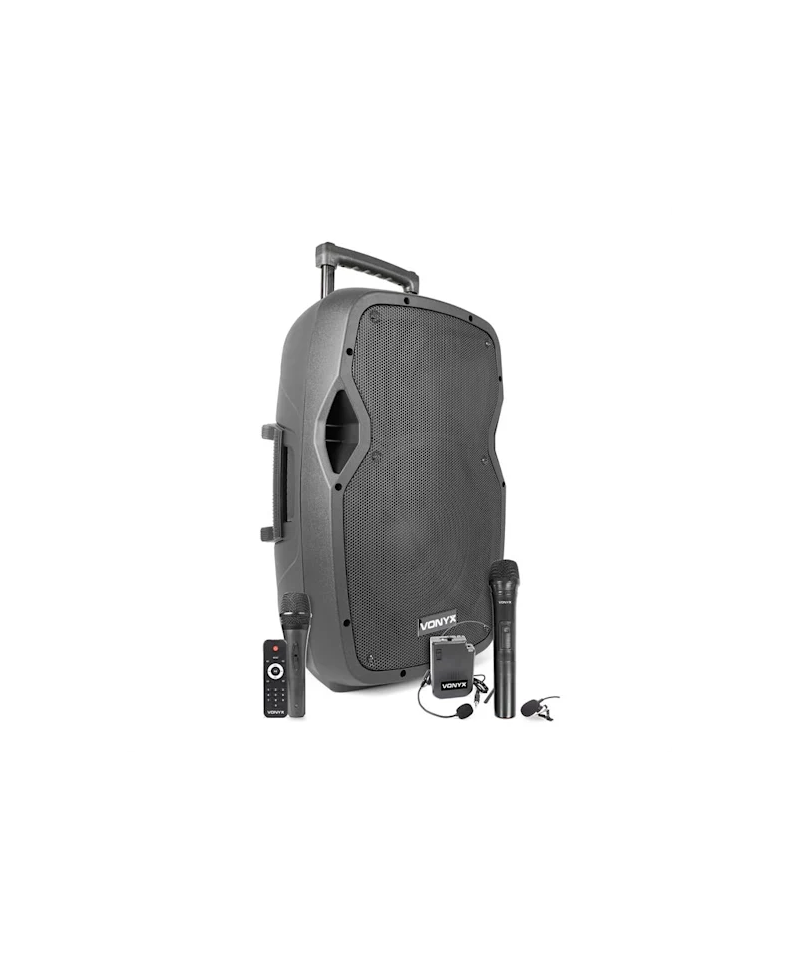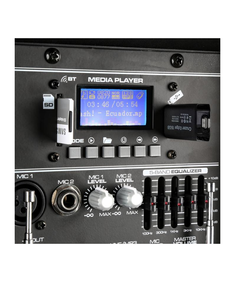 12 600W professional portable diffuser equipped with remote control, USB port and integrated SD card slot for MP3 file playback. This system-in-One equipped with a BT receiver for playing music and wireless UHF bodypack transmitter. It works by power supply or 12V rechargeable battery and then can be effectively used in outdoor environments. control for MP3s, commands for adjusting tones etc.