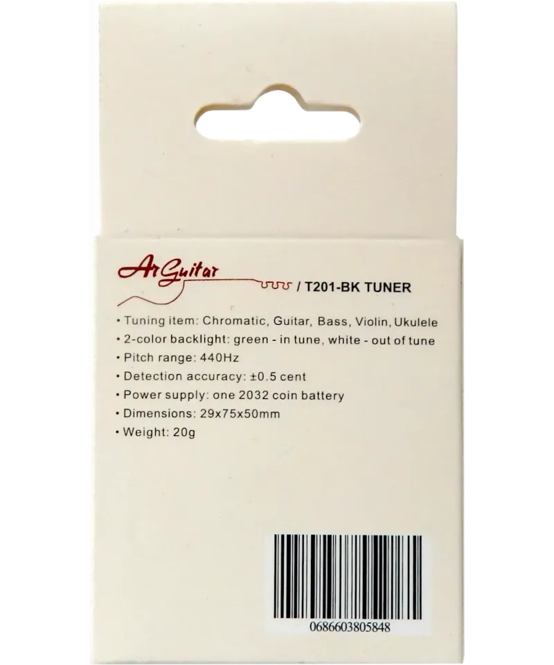 Arguitar chromatic tuner suitable for guitar, bass, violin and ukulele. This tuner is characterized by extremely small size (29x75x50 mm) and a weight of only 20 grams!