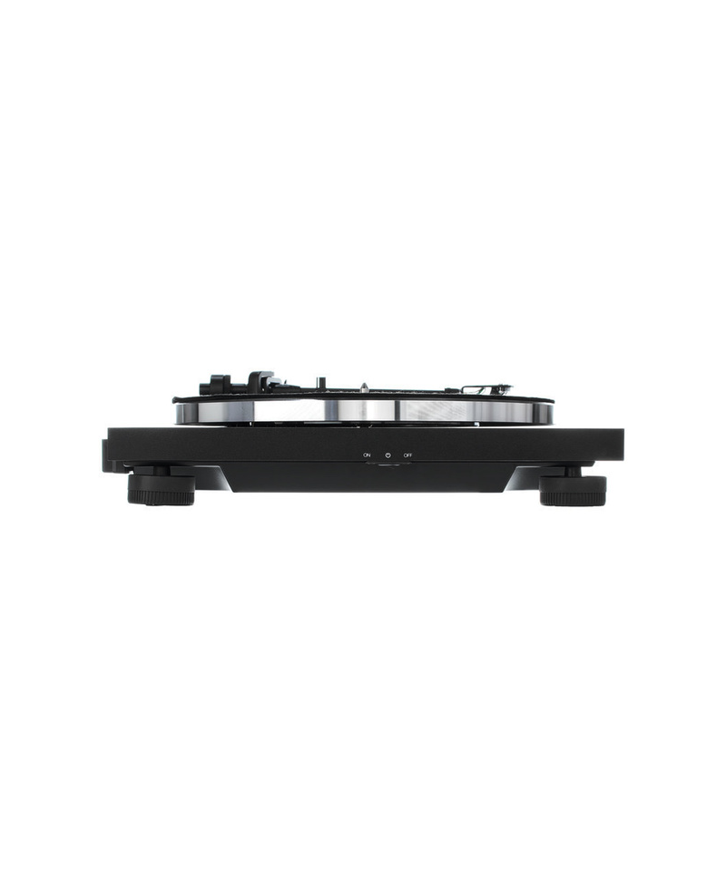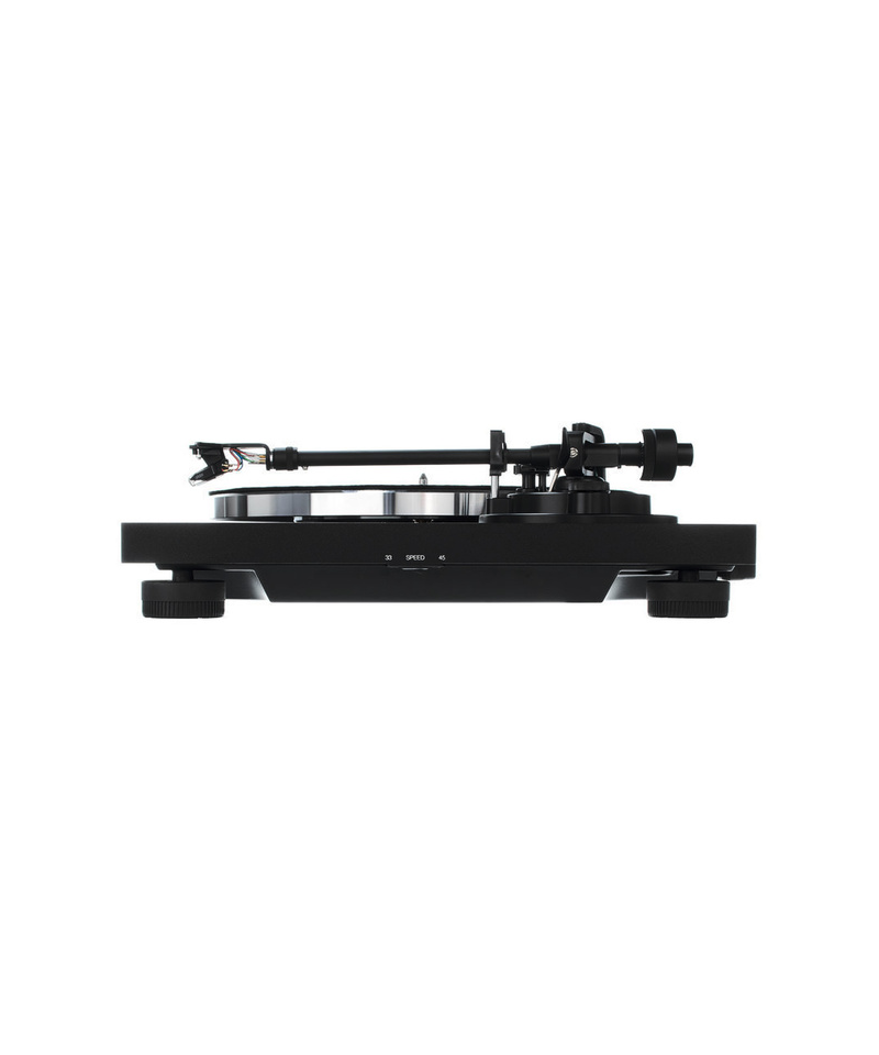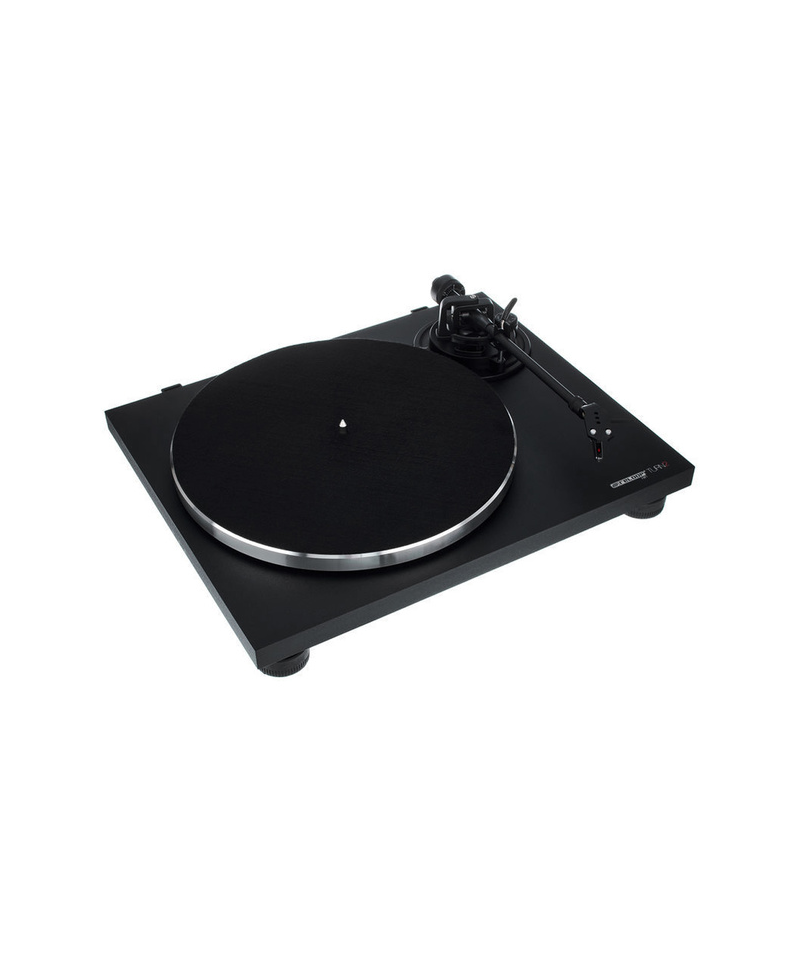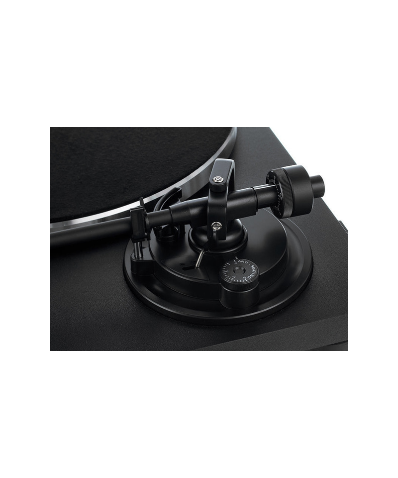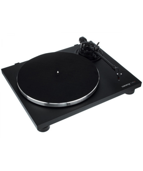 Hi turntable-High quality fi, with belt traction and very low rumor motor, aluminum plate at, selector 33 and 45 rpm, straight arm with manual lifting, knob for anti regulation-Skating and connector for headshell with GM / EMS locking mechanism, anti feet-Vibrations / decoupling, reduced houses in MDF with matt black finish, size mm 420 x 340 x 121, weight kg 4.6, universal external power supply 110-240v. In addition to the power supply includes head and pipelon Om10, dust cover and RCA cable.