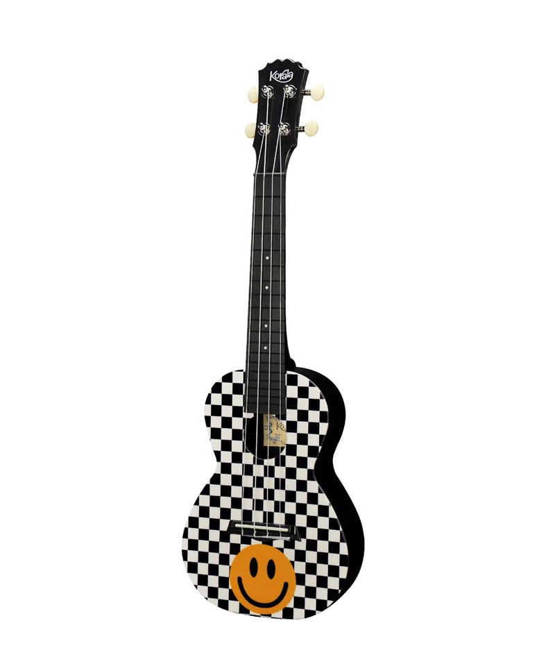 Ukulele Polycarbonate concert, glossy finish. Drawing: Chess with yellow smiley.