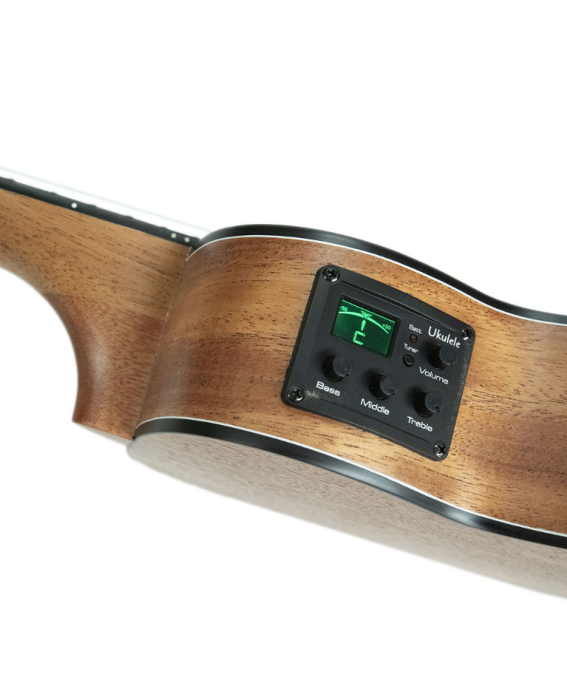 Ukulele soprano with built-in tuner. Mahogany body with solid mahogany bottom and bands. E'Equipped with two outputs for greater sound projection, a front and a side. It has a natural matte finish.