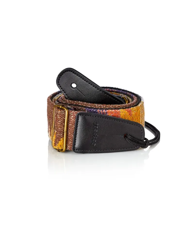 Professional shoulder strap in wool and polyester mixture for guitar, with leather terminals and metal buckles. 5 cm width x 88/156 cm in length. Yellow, brown and blue color pattern.