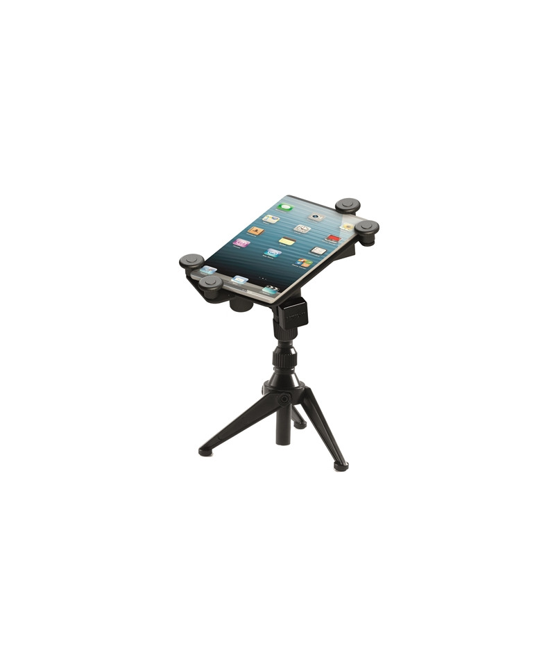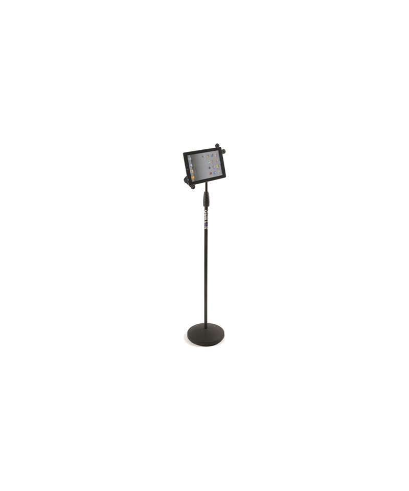 Universal support for tablet. Compatible with tablet of any size currently existing on the market is easily fixed to any microphone rod. The two rubber-covered plastic stopper lock the tablet without interfering with connections, speakers, headphone output, power switch and volume adjustment.