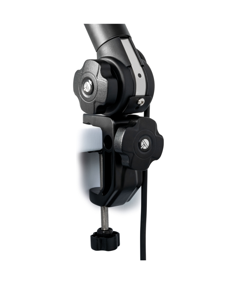 Holdable microphone support, equipped with clamp for fixing to the worktop.