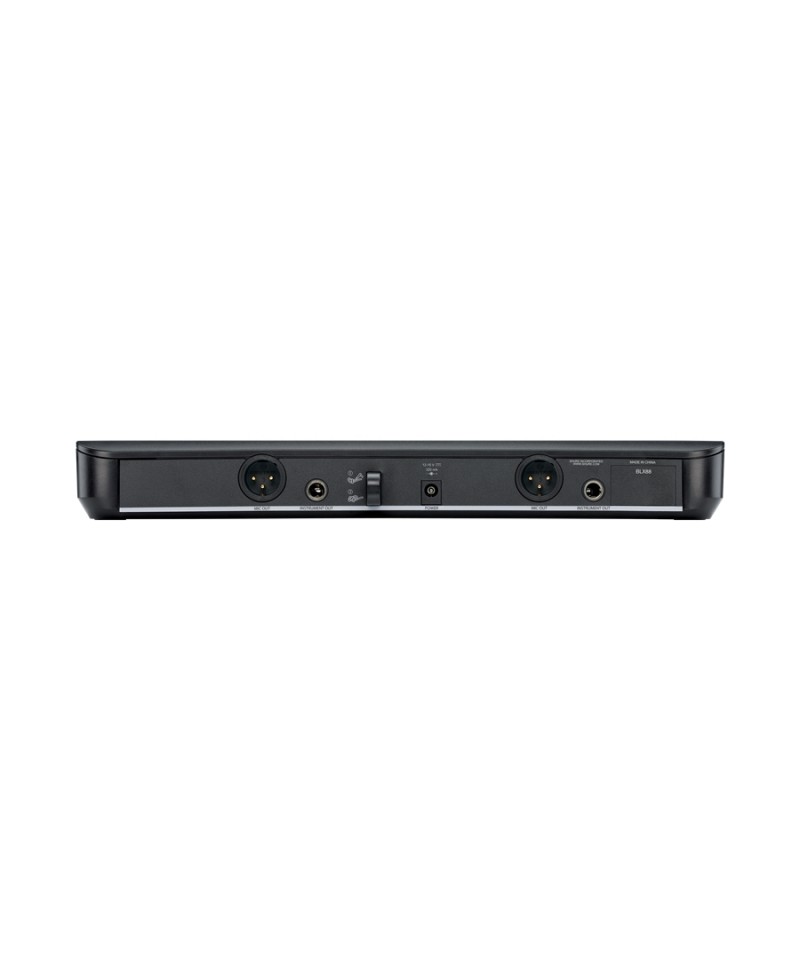 Double wireless system complete for singers and animators composed of a two-channel BLX88E receiver, two BLX2 ice-cream transmitters with Dynamic Cardioded SM58 capsule, supplied with two WA371 terminal supports per rod Microphone.
