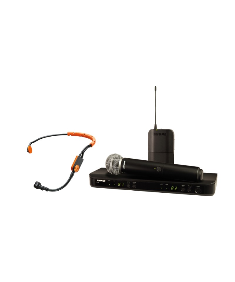Complete system for entertainers and fitness teachers that includes the two-channel BLX88E receiver and SM transmitters with SM31FH Headset radio micrograph and SM58 ice cream.