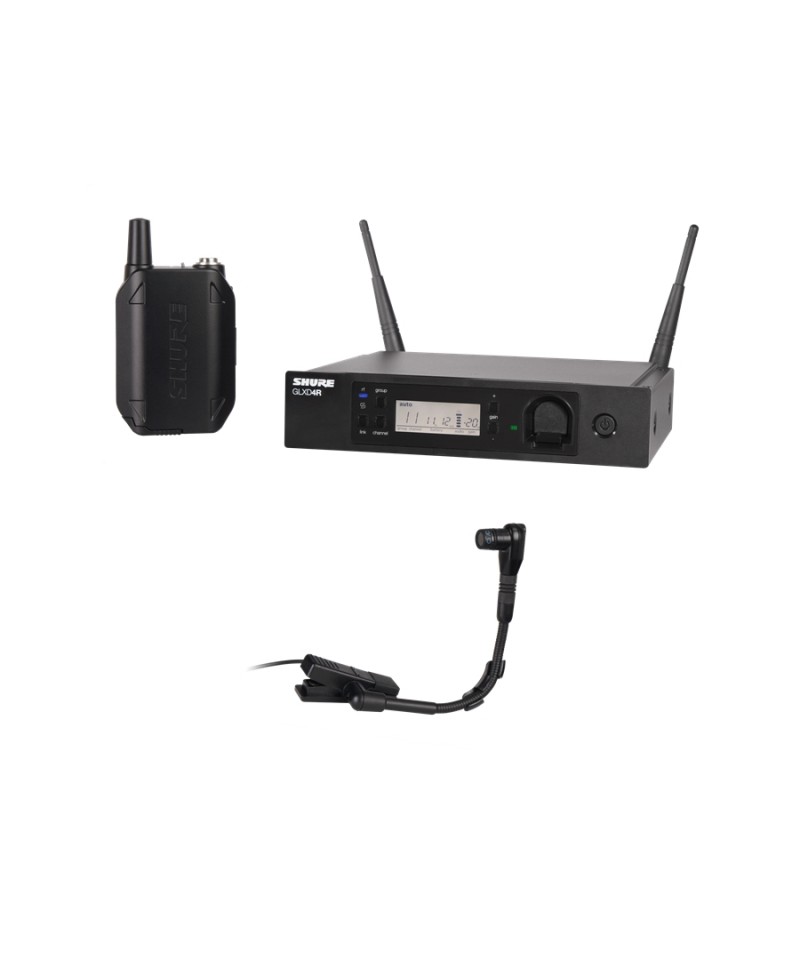 2.4GHz digital wireless system complete for wind instruments, brass, woods, accordions and percussion composed of a GLXD4R receiver, a BodyPack GLXD1 transmitter with SB902 battery and a microphone A Cardioid capacitor with fixing caliper on WB98H / C tool.