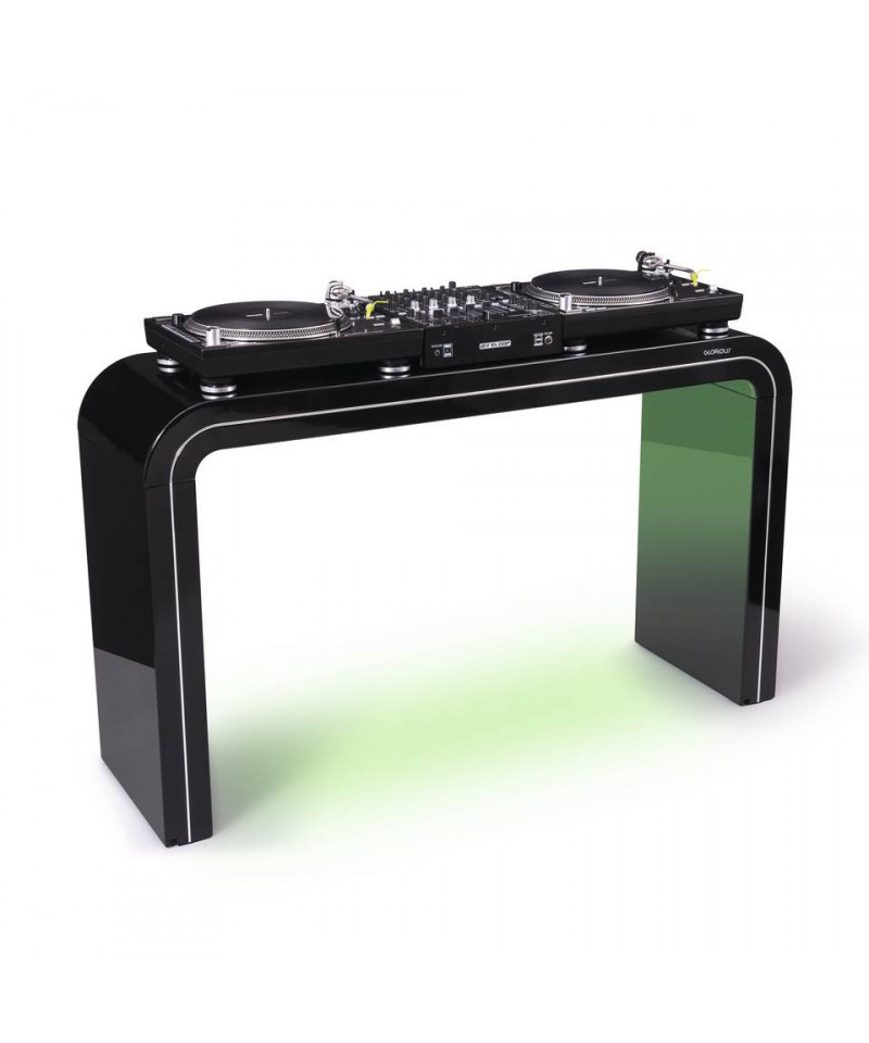 Elegante consolle per DJ dal design minimale e moderno, pensata per essere utilizzata in casa o posizionata allinterno di bar/locali, ideale per il posizionamento di 2 giradischi o CD player e un mixer no a 14 (4+1 canali standard), oppure per un setup composto da laptop e controller, dotata di pratico vano con coperchio rimovibile e fori passacavo posti sul piano superiore perfetto per nascondere ciabatte elettriche, cavi e perno linterfaccia audio, foro di uscita dei cavi in fondo a uno dei due montanti per uninstallazione perfettamente pulita, struttura composta da 3 parti (piano di appoggio e due montanti) per un facile assemblaggio, costruzione solida in legno (MDF) con nitura laccata, illuminazione LED RGB integrata controllabile mediante telecomando (incluso). Dimensioni: 125 x 45 x 90 (h) cm. Peso: 32 Kg. Colore: nero.