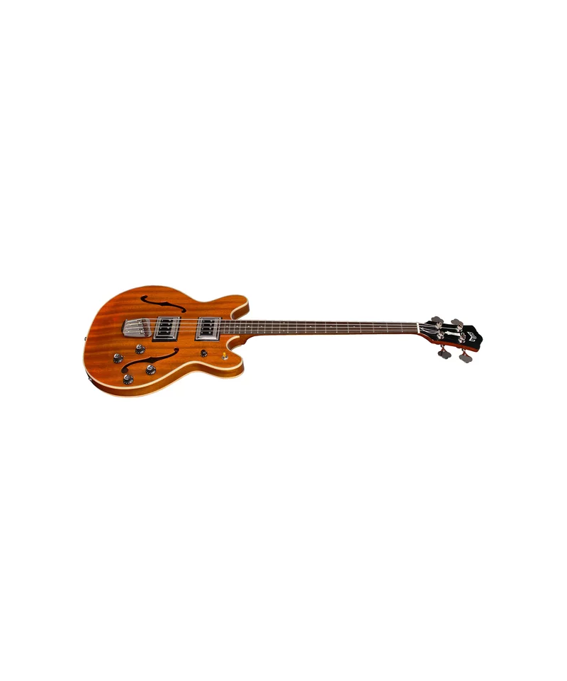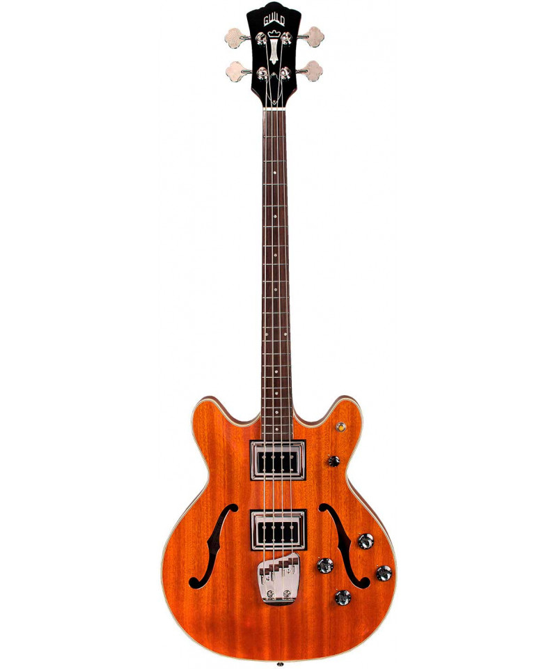 Starfire Bass II un basso da due pickup semi-hollow che aggiunge importanti possibilit sonore ad uno dei pi iconici modelli Guild: il basso Starfire. L'originale Starfire Bass II debut nel 1967, subito dopo la versione a singolo pickup, e rapidamente trov apprezzamento da parte di musicisti come Jack Casady (Jefferson Airplane) e Phil Lesh (Grateful Dead). L' aggiunta del pickup Bisonic BS-1 al manico dona allo strumento un suono caldo e morbido, per grande versatilit. Questo basso a doppio cutaway presenta top e fondo in laminato di mogano arcuato (Arched) , il manico in mogano in tre pezzi con rinforzo in acero centrale con profilo ''Soft U'', il nut di 38 mm e la scala dello strumento di 781 mm, la tastiera in palissandro con dot in madreperla. In dotazione troviamo i pickup dual Guild BS-1, con manopole individuali per volume, tono, e master volume e uno switch per la selezione, il ponte regolabile della Guild con sellette in palissandro o Ebano mentre le meccaniche sono grover 142 Vintage. Una chiara finitura high gloss poliuretanica lucida Natural contribuisce alla bellezza di questo basso. Starfire Bass II offre il classico suono Guild vintage vibe ai bassisti moderni.