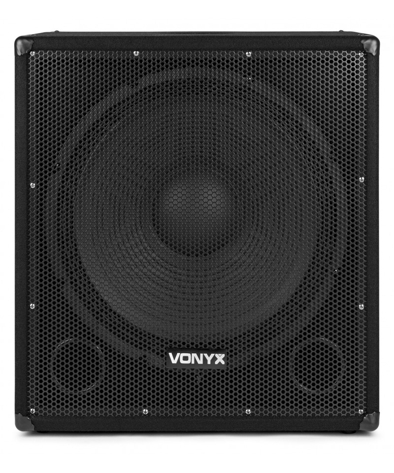 Subwoofer attivo bi-amplificato dotato di maniglie di trasporto, griglia in metallo e cappello a cilindro per il montaggio su supporto. Dotato di lettore multimediale MP3 e tecnologia BT per lo streaming audio.